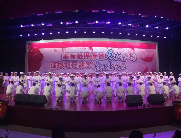 此次活动共分为授帽仪式、护理技能比赛、护理专业形象展示三部分。在嘹亮而柔美的护士之歌中,2015级新生纷纷戴上了洁白无瑕的燕尾帽,并在学院党委书记贾秀英的带领下宣读了庄严而神圣的护生誓词,同学们手捧蜡烛高唱护士之歌,歌声响彻了整个礼堂,唱出了即将作为一名护理人员的自豪。授帽仪式之后,便是精彩而又紧张的护理技能大赛,此次比赛首次采用案例多站式的形式开展,将理论与操作相结合,考察了学生皮内注射、心肺复苏及静脉输液三项护理操作技能,及以现场提问的形式考察学生的临场应变能力。六组参赛同学共24名,来自不同年级的选手以娴熟的操作,专业的态度,专注的神情打动了评委及在场的每一位观众。比赛结束后由常务副院长郭永洪作了点评,她表示:深深被同学们的表现感动,同时也为同学们在比赛中展现出来的团队合作精神而欣喜,并期望技能操作比赛能越办越好!活动最后,护理礼仪展示队伍向观众展示了护理人员在操作中的推、蹲、坐、站等姿态,举手投足间无一不展示了护理独特的礼仪风采和文化魅力。