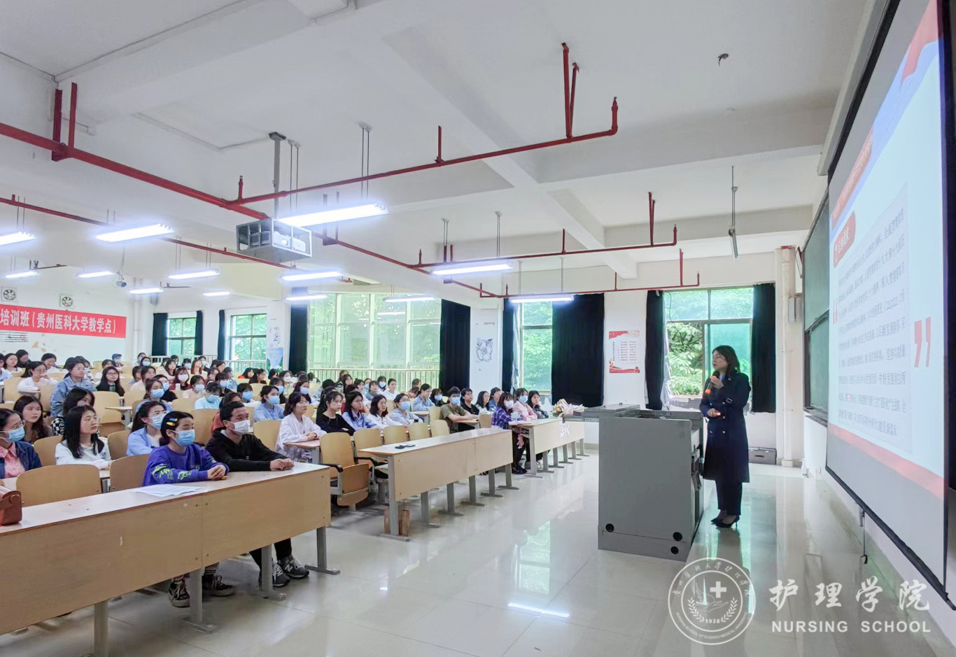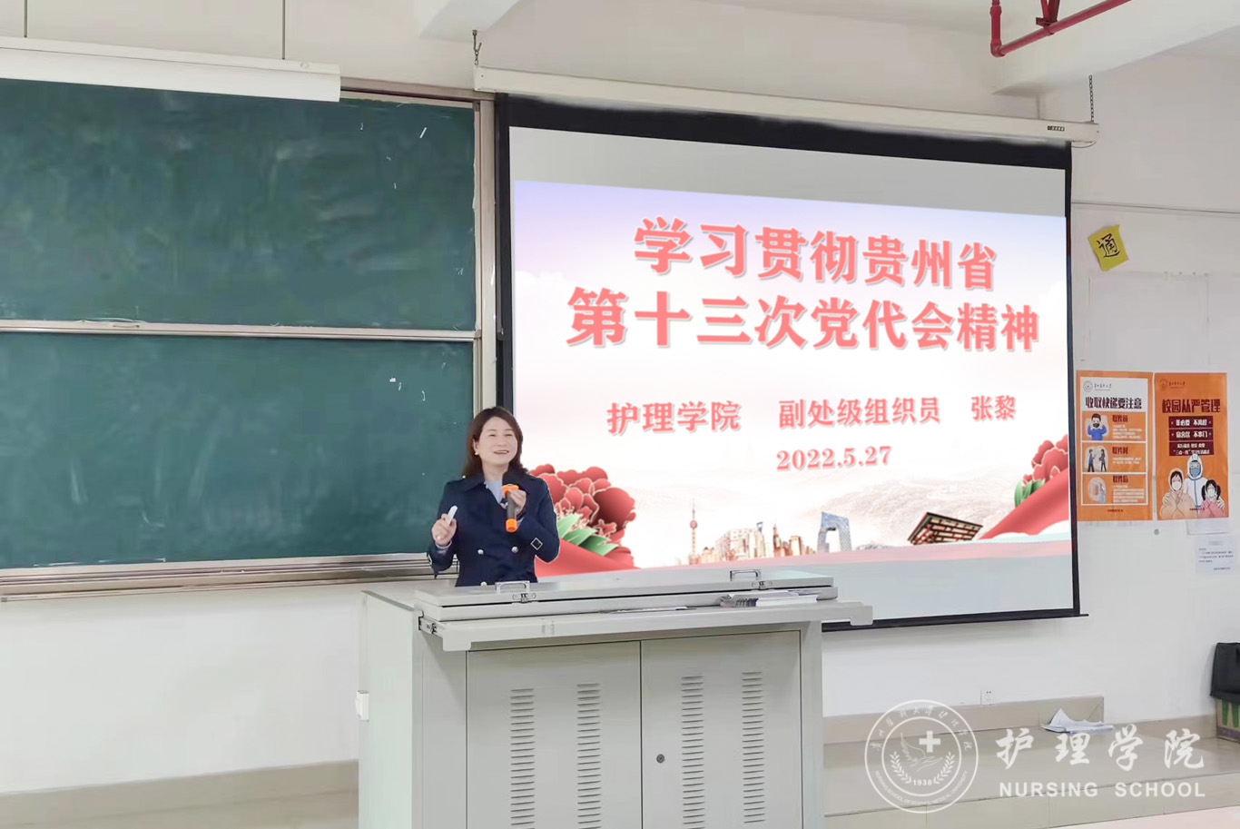 5月27日,为深入学习贯彻中国共产党贵州省第十三次代表大会精神,allwincity万象城官方网站党委委员、副处级组织员张黎在北校区4201教室为护理学2019级甲班和学院第12期发展对象培训班学员进行了大会精神宣讲。