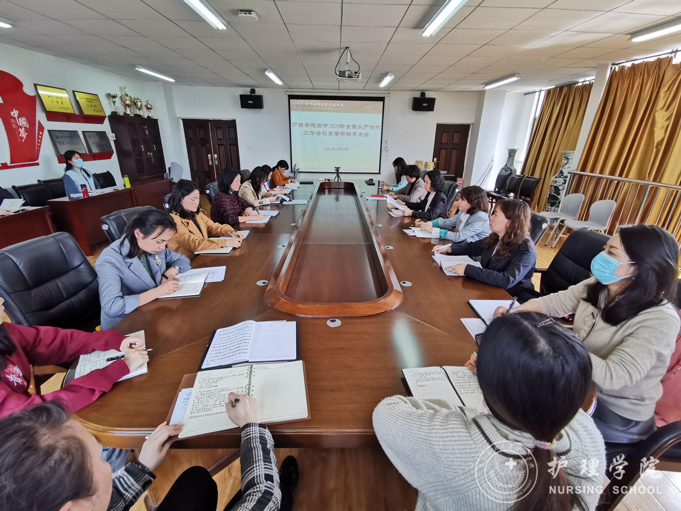 会上,杨英传达学习了二十届中央纪委二次全会精神、十三届省纪委二次全会精神、2023年全省教育系统全面从严治党工作会议精神。通报了学校开展师德师风自查自纠和专项整治工作要求,并对工作做了部署。期间,与会人员还学习了党风廉政警示案例,观看警示教育片《筑牢国家安全屏障——总体国家安全观贵在行动》,组织科级干部签订干部廉洁自律承诺书。