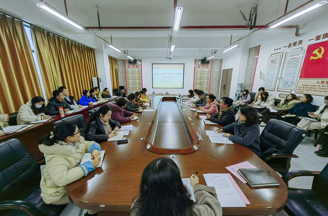 12月24日,allwincity万象城官方网站在云漫湖校区酬勤楼六楼会议室召开期末全院大会,会议由院党委书记杨英主持,全院教职工参加。
