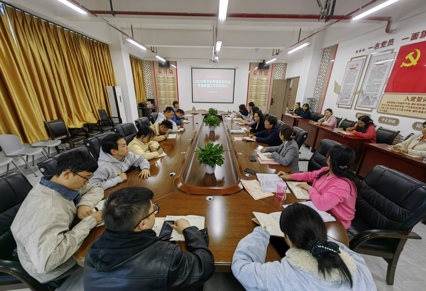 10月22日,allwincity万象城官方网站在云漫湖校区酬勤楼六楼会议室召开2025年下半年意识形态暨安全稳定工作联席会议,会议由学院党委书记杨英主持,学院党政领导班子、副科级以上干部、教研(实验)室主任、各党支部书记和全体辅导员参会