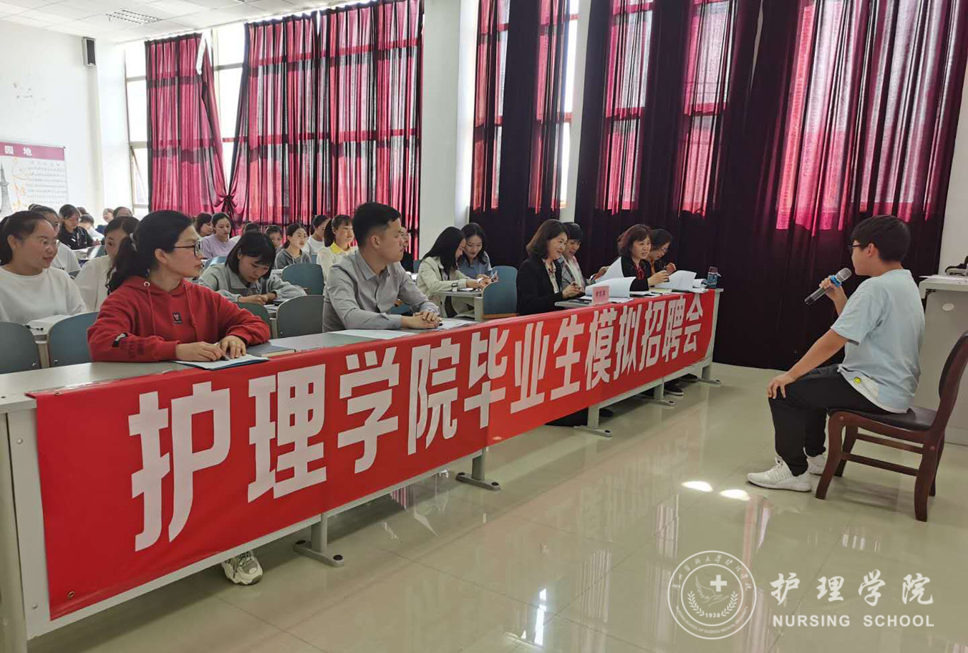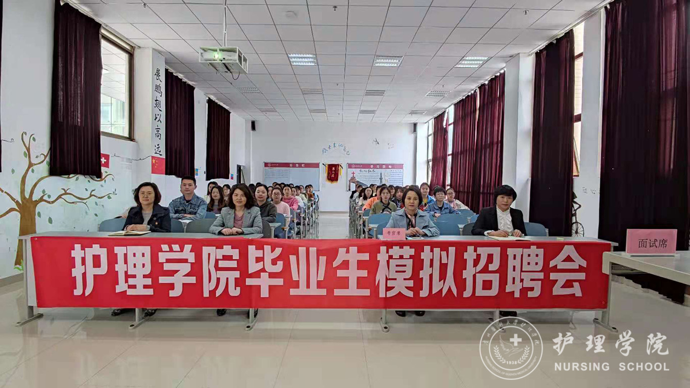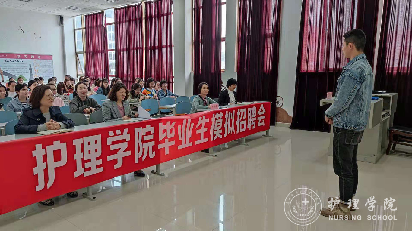 本次面试包括自我介绍、现场提问、现场演示三个环节。同学们用简单明了、真诚坦率的言语向面试官介绍了自己的专业能力和大学生活。面试官从应聘相关科室的原因、医患关系的处理、护士核心素质的理解、突发状况的处理等方面对学生进行了提问与点评。护理人文教研室主任张仁莉老师向学生现场演示面试仪容仪表,包括站姿、坐姿、走姿、神态表情等细节,让同学们受益匪浅。