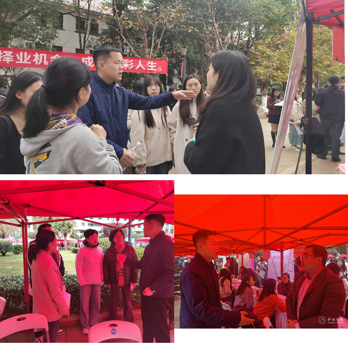 招聘会现场,同学们穿着得体大方,带上自己精心准备的简历应聘心仪岗位。招聘会现场,学院党委书记杨英对学生进行一对一就业指导,叮嘱同学们要学会主动分析研判当前的就业形势,敢于竞争、善于竞争,在就业市场中抢占先机,稳就业、稳择业。期间,学院党委副书记兼纪委书记何为积极与招聘护理学、助产学的四十余家用人单位现场沟通,精准推送万象城官网优秀毕业生。此次招聘会效果良好,同学们在老师们的指导下精准投递简历。