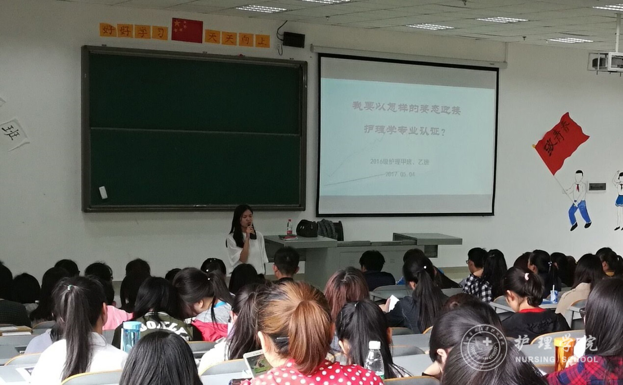 在2014级护理班、2016级护理甲班及护理乙班,卢海霞老师首先详细介绍了什么是“护理学专业认证”。其次,从“护理专业认证的目的和意义、认证的关键、认证考察与学生相关的重点”等方面做了介绍,强调护理学专业认证的重要性,并联系自己的经历与同学们分享学习《护理学专业认证》的大纲内容。最后,卢海霞老师向同学们提出几点要求:希望同学们充分认识认证工作对建设发展学校和学院的重要意义,在迎接护理学专业认证的同时,加强自身建设与发展,成为全方位的栋梁之才。