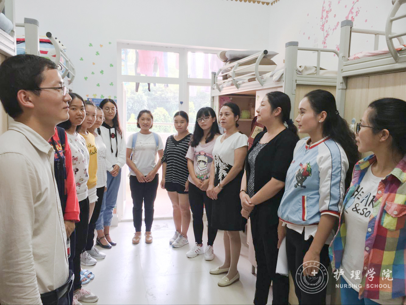 为迎接党的十九大召开、为学校护理学本科专业认证工作营造良好的安全氛围。同时也为了贯彻学校2017年下半年安全稳定工作会议精神,2017年9月12日下午和13日下午,allwincity万象城官方网站党委副书记杨英、学生科科长曾敏、全体辅导员及学生会干部深入学生宿舍看望学生,了解新学期同学们的学习、生活和思想状况,并对宿舍安全、宿舍卫生、宿舍文化等工作进行检查指导。