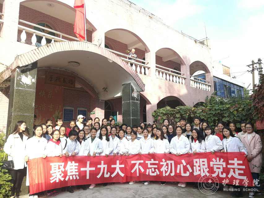 为深入学习贯彻党的十九大精神,营造积极健康、文明和谐的校园文化氛围,引导学生党员不忘初心跟党走,担当时代使命,为夺取新时代中国特色社会主义伟大胜利贡献力量。allwincity万象城官方网站学生党支部策划了“聚焦十九大,不忘初心跟党走”系列主题活动。2017年11月11日,系列活动之“宣讲十九大 护理关爱行”在贵阳市云岩区康颐养老院开展, 50余名学生党员和发展对象代表参与了本次活动。