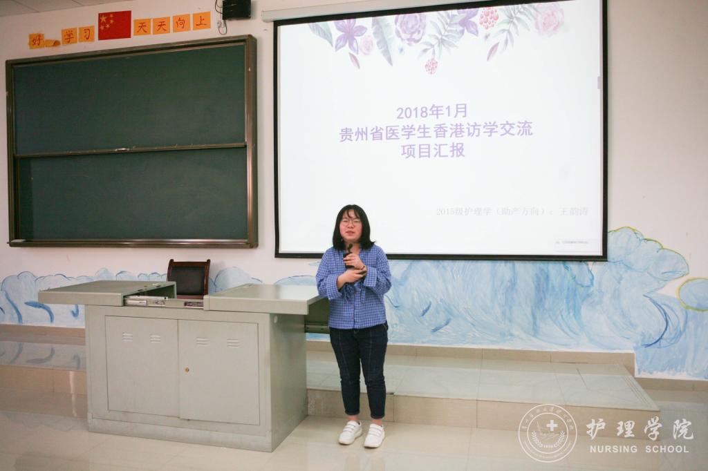 会上,参与2018年1月贵州省医学生香港访学交流项目的2015级护理助产方向王韵涛同学,从香港医疗体制、香港港安医院交流、香港浸信会医院学习、文化生活体验等四个方面,用精心准备的汇报材料详细介绍了到香港访学的基本情况、自己的学习生活及访学体会,重点讲解了香港医疗体制、护理学士教育和香港医疗发展现状。鼓励参会同学抓住机遇,多去不同的环境,体验不同的文化,开阔眼界,不断成长。