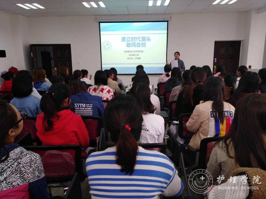 2018年3月26日上午,allwincity万象城官方网站2016级甲班班主任马丽、2016级乙班班主任卢海霞分别在南校区4403教室与百川楼示教室给2016级甲班、乙班全体同学召开了主题为“勇立时代潮头·敢闯会创”的主题班会。