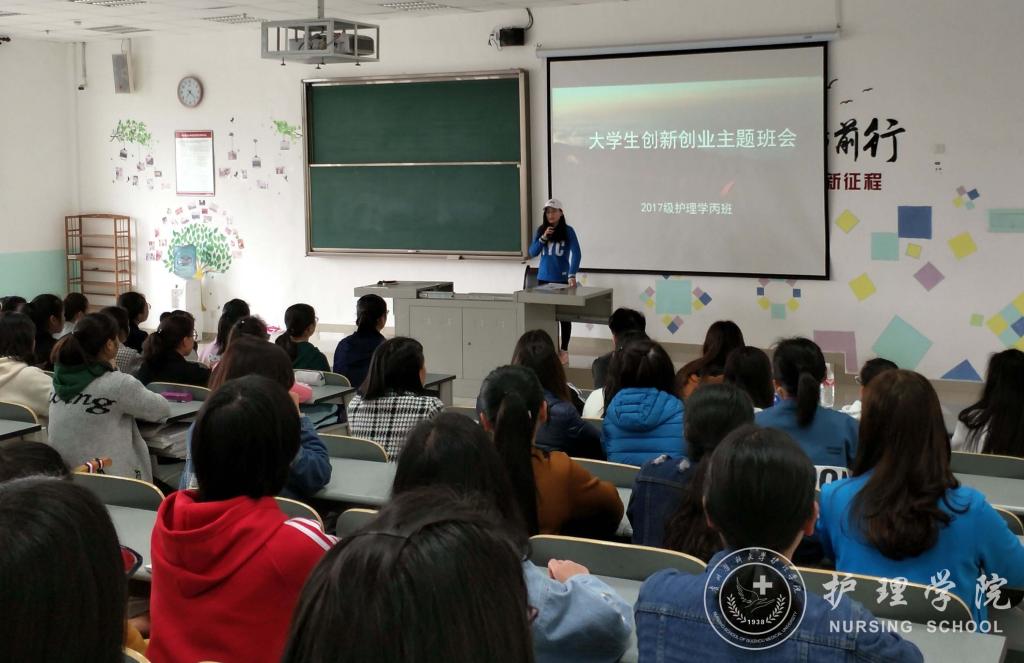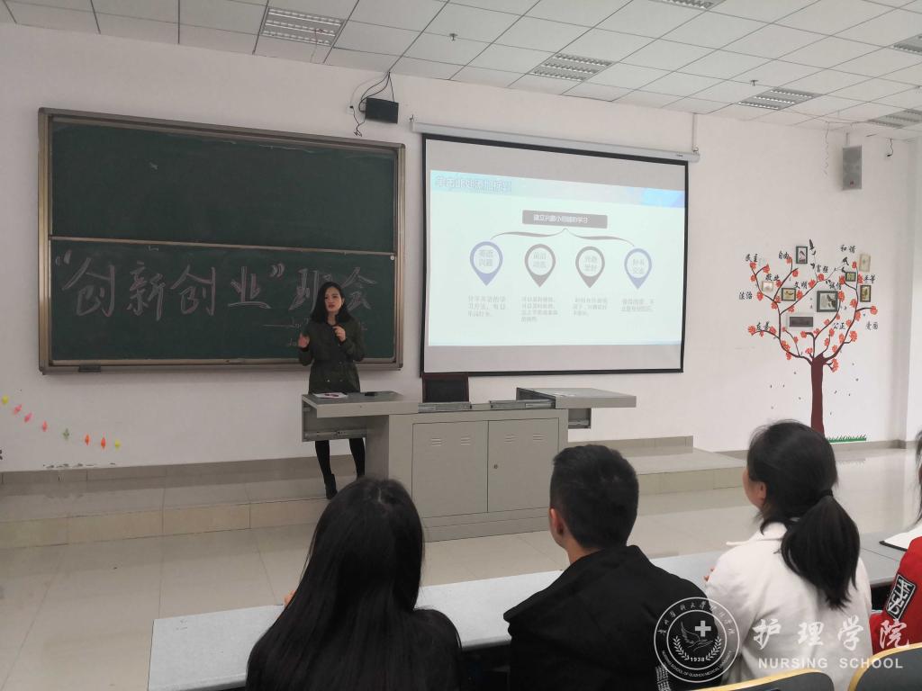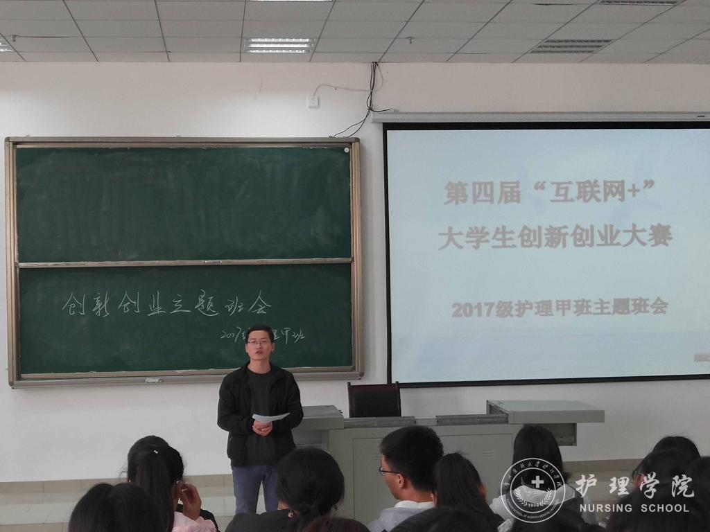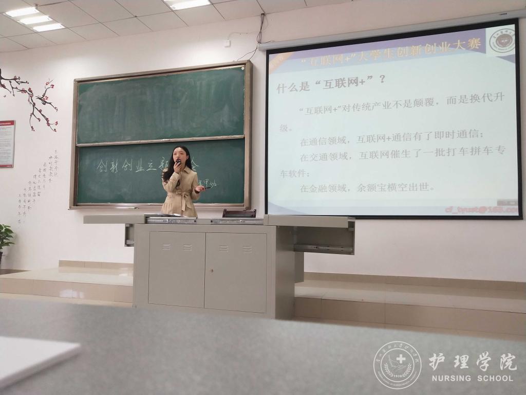王晓玲、马景瑶分别解读了国家对大学生创新创业的支持政策、学校的大学生创新创业大赛通知、学校对大学生创新创业的激励政策、allwincity万象城官方网站学生在历年创新创业大赛活动中的获奖情况等,使广大新生对创新创业有了一个基本的了解。王晓玲、马景瑶鼓励同学们在认真完成专业学习的基础上积极参加创新创业活动,在创新创业中增长智慧才干,在艰苦奋斗中锤炼意志品质,在服务社会中成就人生价值。接着,由班主任吴俊、王丽、李宇分别在2017级护理学甲班、乙班、丙班以第四届“互联网+”大学生创新创业大赛为主题进行了专题讲授。班主任老师分别从大赛主题、参赛内容、准备方法等方面具体介绍了大学生创新创业大赛,激发同学们参与的意识。
