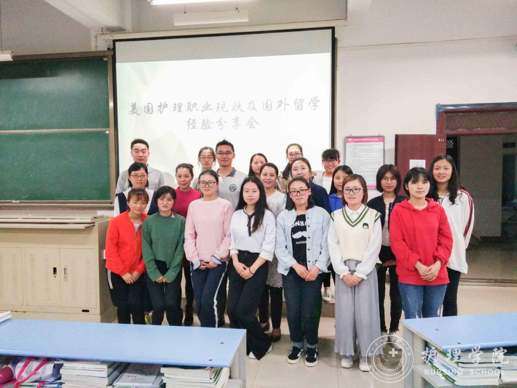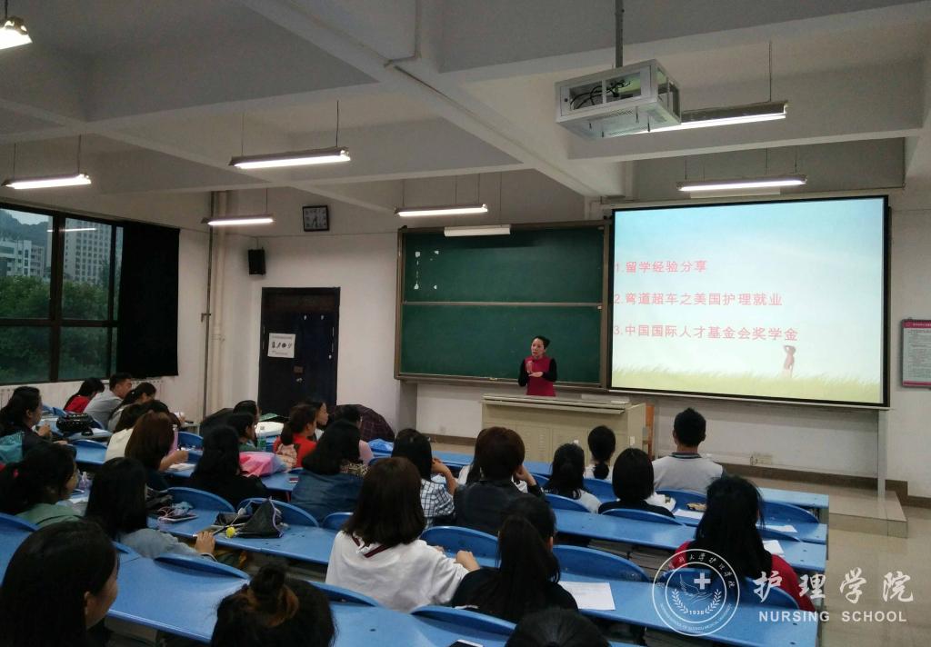 2018年5月31日下午7:00,allwincity万象城官方网站于北校区2401教室召开了“美国护理职业现状及国外留学经验分享会”,分享会邀请到美国海格斯大学出国留学区域负责人彭冰老师为万象城官网学生进行了交流指导,allwincity万象城官方网站党委副书记杨英、护理技能实验室主任周谊霞、学生科科长曾敏、辅导员李杏春和2014、2015级部分同学参加了此次交流会。会议由周谊霞老师主持。