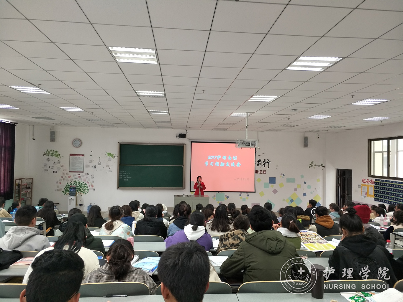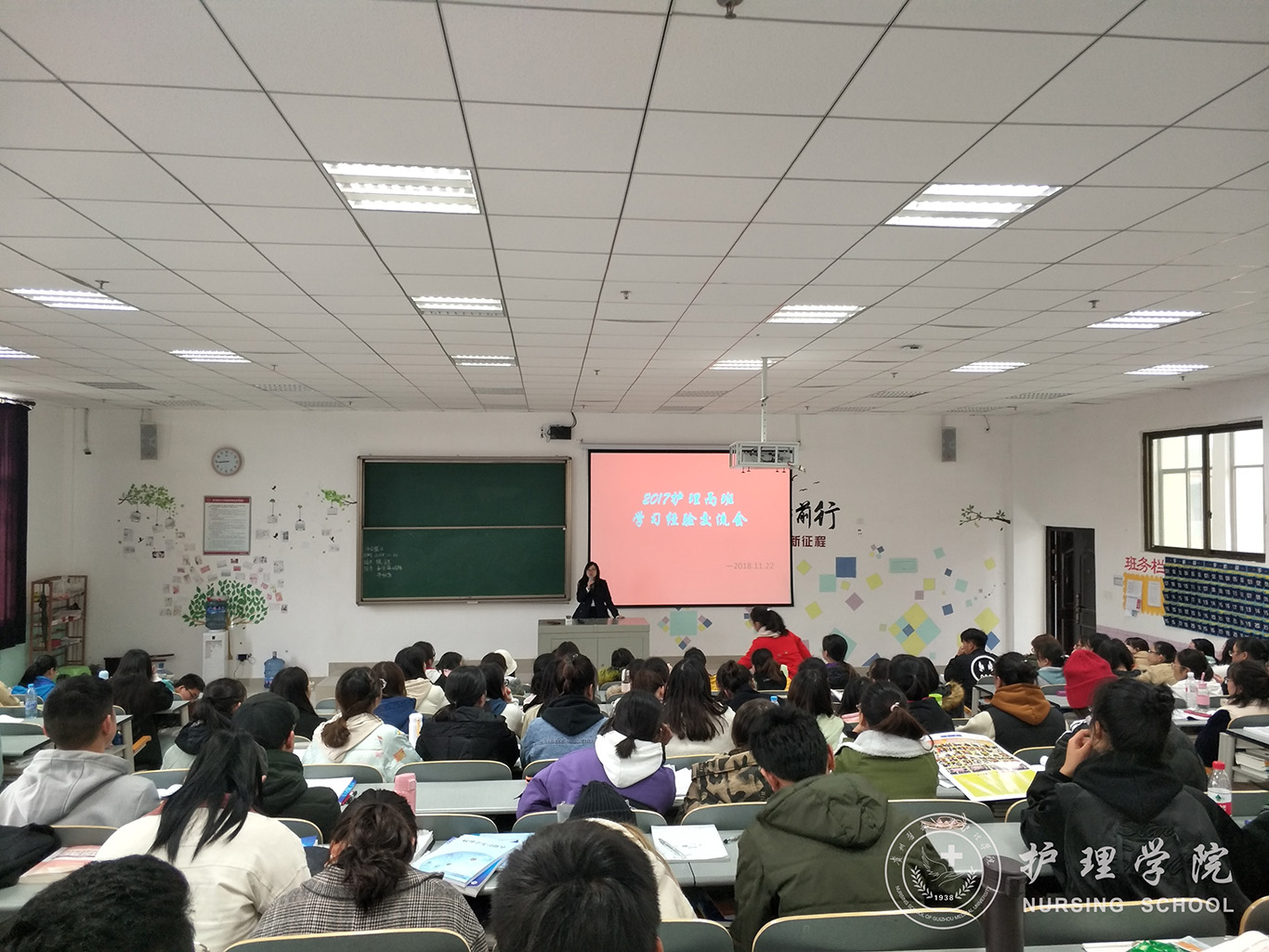 11月22日下午,allwincity万象城官方网站分别在南校区7405、1302教室开展学习经验交流主题班会,本次班会邀请2015级护理学专业王洁、高汝琪两位同学主讲,辅导员王晓玲老师和班主任李宇老师、罗晶老师以及护理学2017级丙班和2018级丙班全体同学参会。