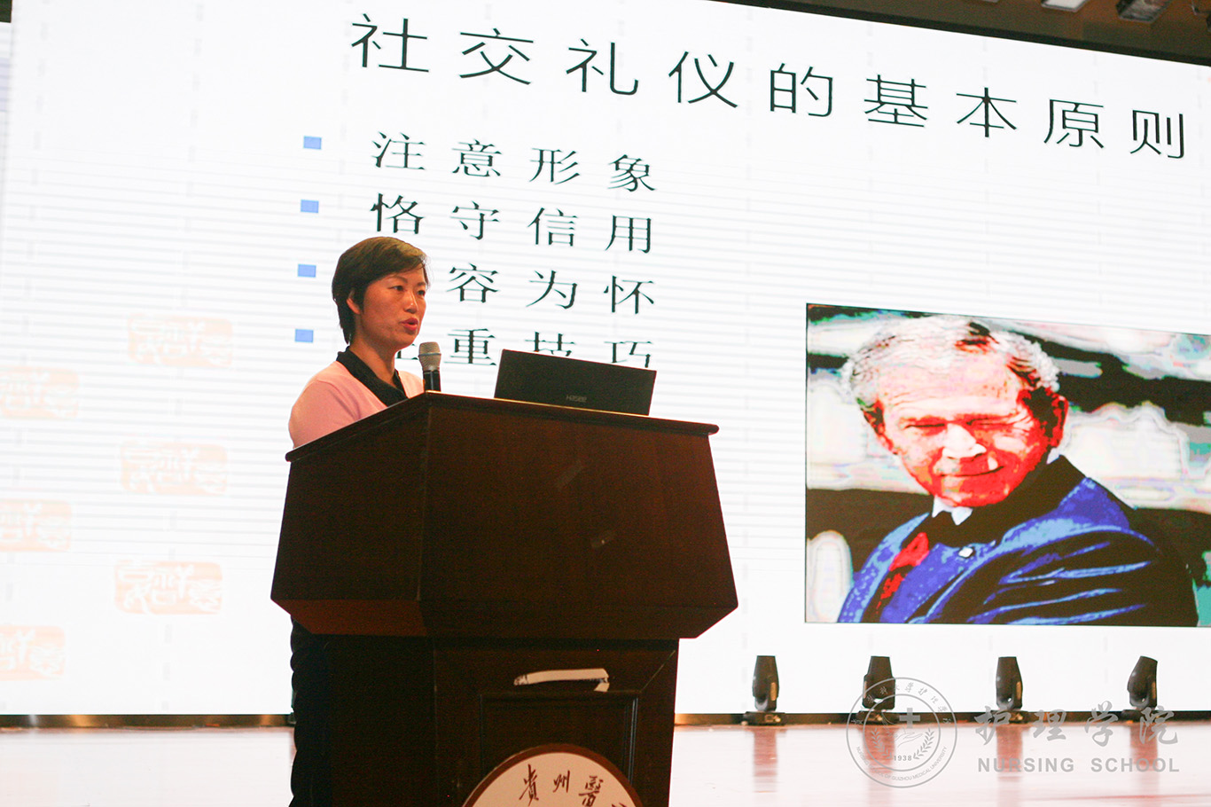 首先,王秀红从两个真实发生的案件引出了本次讲座的主题,并指出了文明礼仪的重要性。接着,对礼仪的含义及基本原则,礼仪修养的过程进行了概况性介绍,结合同学们日常生活和学习从仪表仪态礼仪、社交礼仪、学校礼仪规范等方面进行了讲解,并重点普及了宿舍礼仪、课堂礼仪及师生交往礼仪等与师生工作、学习、生活密切相关的礼仪规范。讲授过程中王秀红还时不时地列举一些礼仪故事,幽默风趣的讲述吸引了全场听者的注意力。