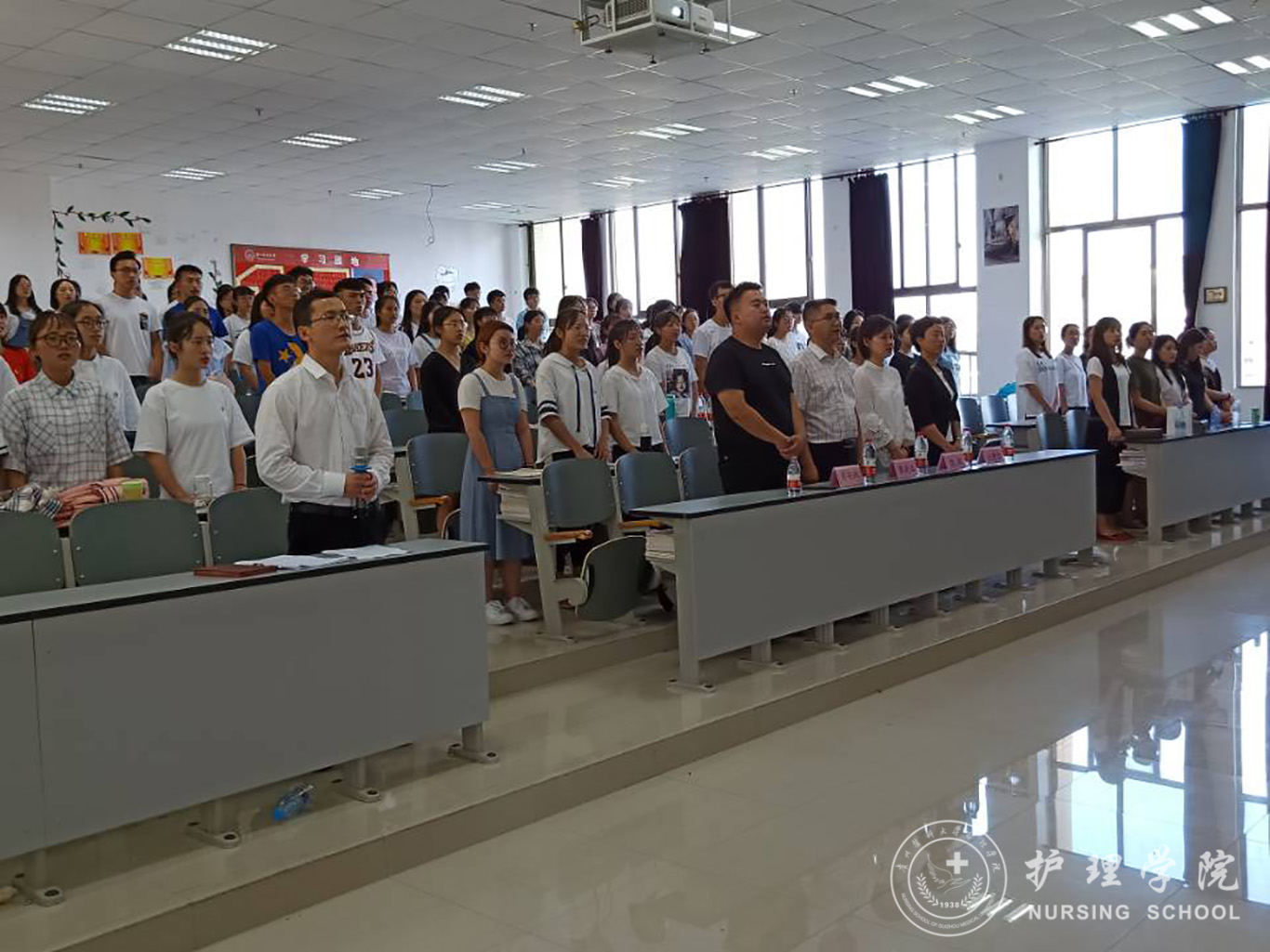 下午六时整,马景瑶宣布开班典礼开始,全体起立,奏唱国歌。接着,王秀红代表护理、医管、口腔党委领导向培训班学员提出四点要求:一是提高思想认识,充分认识举办本次培训班的重要意义;二是树立正确入党动机,发挥先锋模范作用;三是端正学习态度,保证学有所获;四是加强组织管理,提高培训质量。最后,护理学2018级乙班步相艳同学代表培训班全体学员做出承诺:要遵守党校纪律,认真参加培训;及时总结反思,主动学习交流;提高思想觉悟,做到知行合一;努力在实际行动中争取早日加入中国共产党。