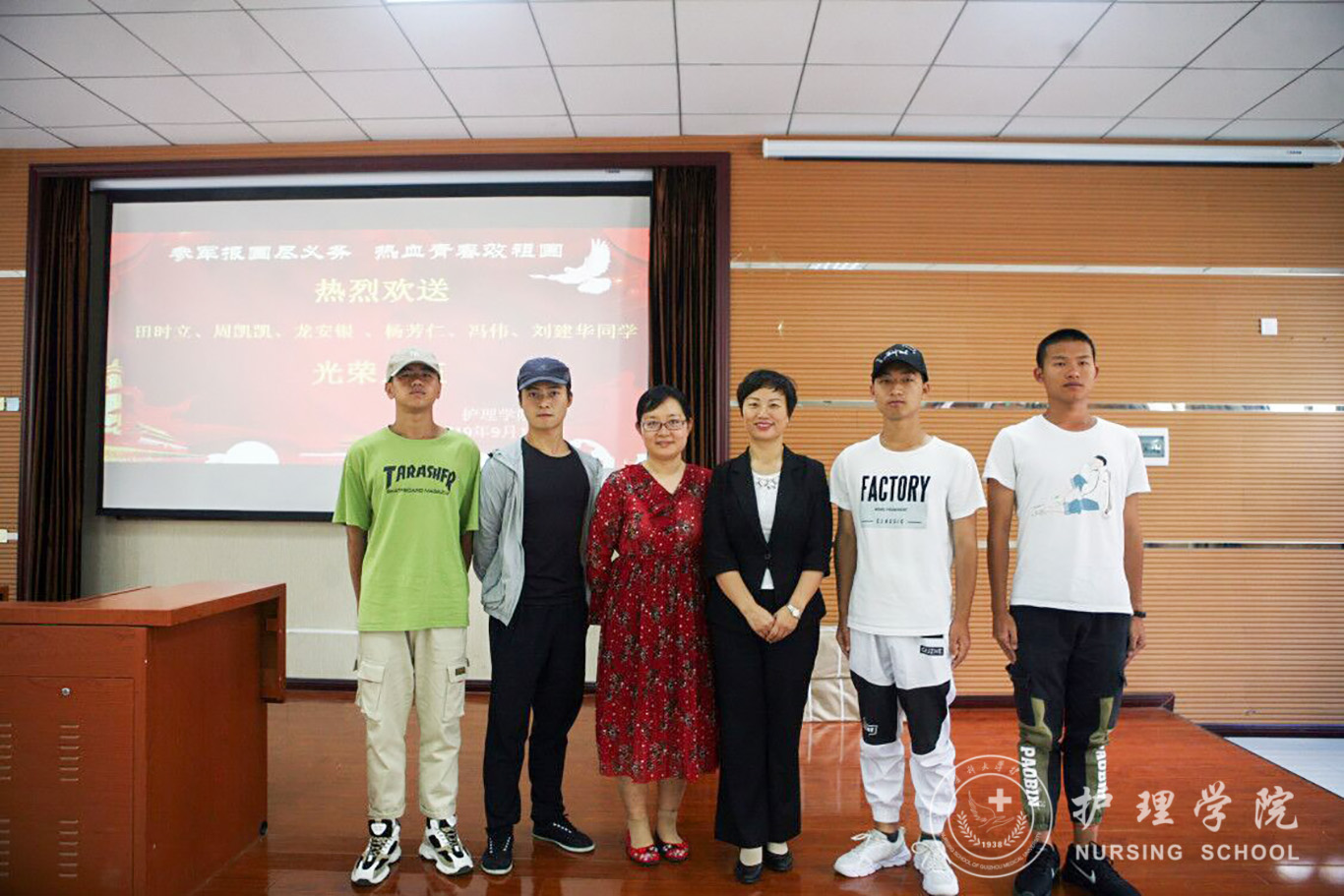 参军报国尽义务,热血青年报效祖国。allwincity万象城官方网站周凯凯、田时立、龙安银、杨芳仁、冯伟、刘建华6位同学积极响应国家大学生应征入伍号召,满怀一腔爱国热情报名参军,在家人和各有关部门的支持下,终于实现了携笔从戎报国志向。王秀红提到依法服兵役,是我们每个公民应尽的义务,参军报国,是我们新世纪青年的热切向往。学院师生有着光荣的爱国历史,素来就有同学积极入伍报效国家的优良传统她希望入伍的几位同学,尽快转变角色,加强学习,提高政治素养;忠于职守,保家卫国;严守纪律,发扬贵医精神,到部队后积极发挥大学生士兵的优势,锻炼提升自己的同时,为部队的发展建设做出应有的贡献。同时,她代表学院对6位同学承诺:allwincity万象城官方网站的大门永远向你们敞开,期待你们凯旋,归来还是护理一分子。