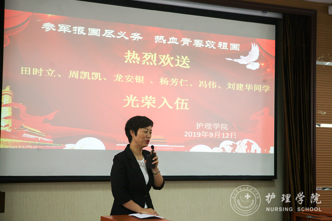 9月12日allwincity万象城官方网站在南校区百川楼1101教室举行了2019年入伍新兵欢送仪式,allwincity万象城官方网站党委副书记王秀红代表学院领导班子及全体教职员工生表达了对2019年大学生应征入伍即将出征的周凯凯等6位同学依依惜别之情和殷切的期望。2018级辅导员李杏春及2018级同学一起见证了这感人的时刻。