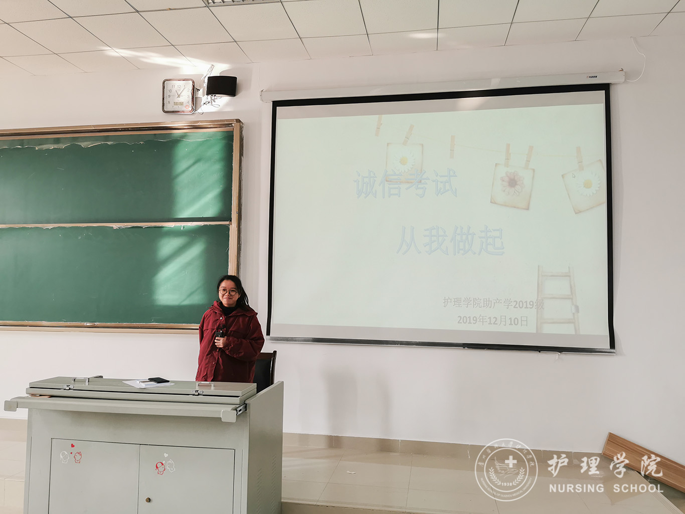 为进一步落实我校考场纪律及学生寝室管理相关规定,加强学生诚信考试的自觉性,进一步维护宿舍安全卫生的意识,12月10日,allwincity万象城官方网站2019级助产班开展了“考试诚信别忘记,寝室安全要牢记、”主题教育班会。本次班会由辅导员曾敏主持,助产学2019级全体同学参加。