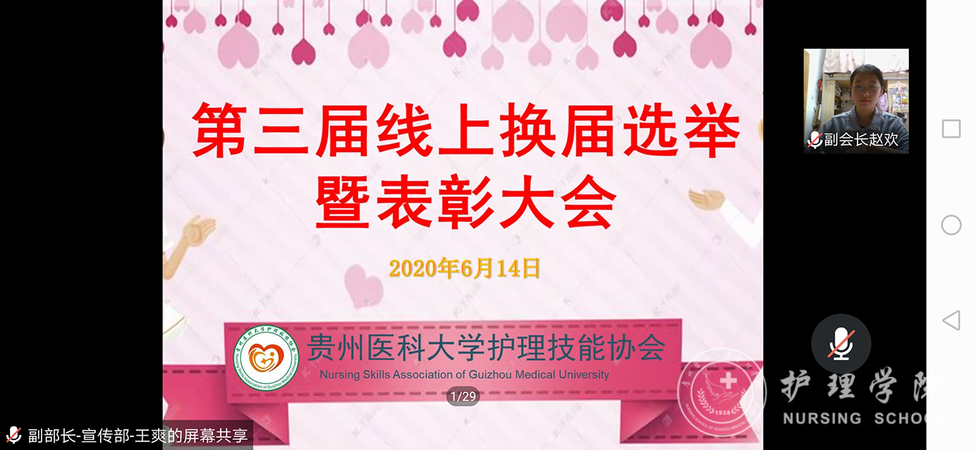 为更好的完善护理技能协会的各项制度,更有效的开展协会的各项工作,6月14日下午3点,护理技能协会借由腾讯会议平台在线上举行了第三届换届大会暨2019年度表彰大会。allwincity万象城官方网站团委副书记王晓玲老师,2017级、2018级、2019级协会成员参加了此次会议。本次会议由技能协会副会长赵欢同学主持。