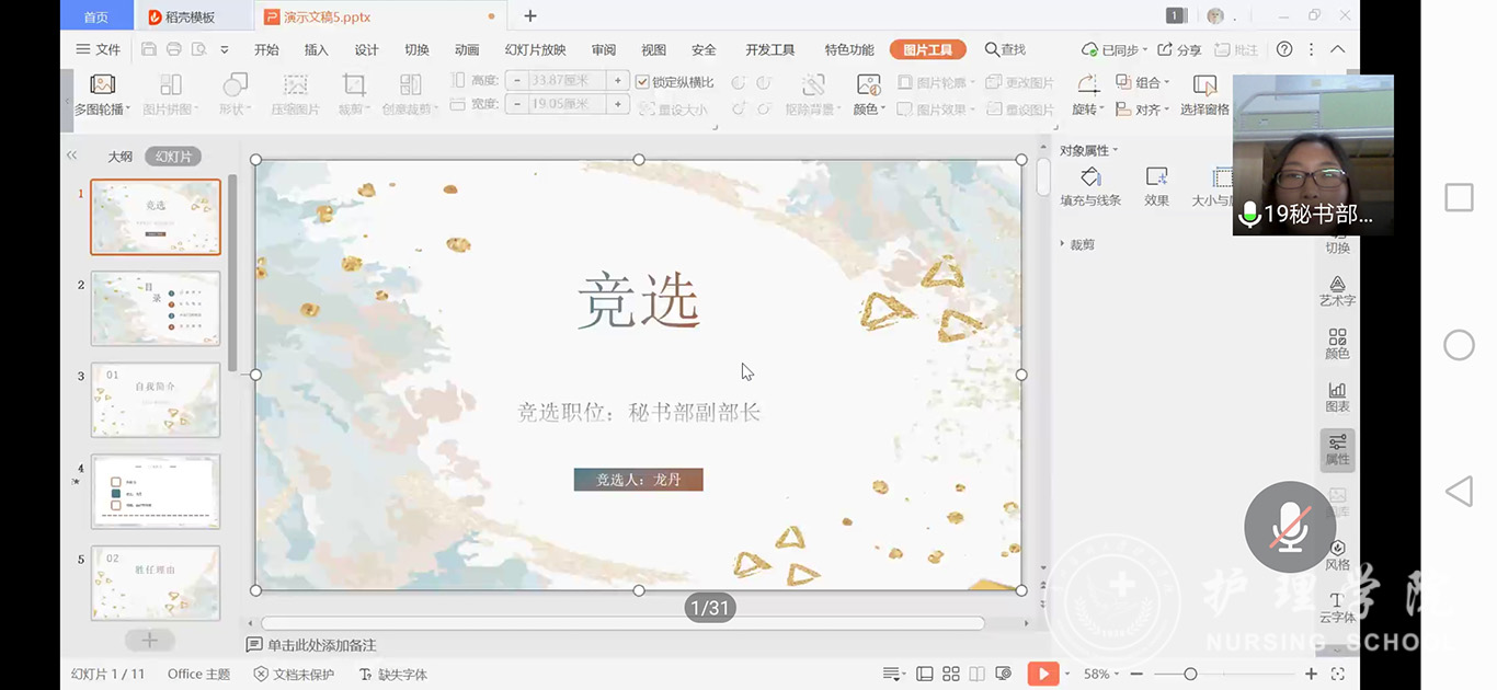 会议共分为三项内容。第一项为表彰大会,由王晓玲老师宣读获得优秀干部以及优秀成员的名单,优秀干部代表秘书部副部长杨庆庆同学和优秀部员代表策划部刘筱璇同学作为代表发言,表述了各自在协会活动中的收获,感谢老师和同学们的帮助,让自己在各方面都得到了很好的提升。会议第二项为换届选举,本着公平、公正、公开的原则,选取方式为问卷星进行线上投票。竞选会长、副会长、各部门部长、副部长的同学依次进行了演讲,每位同学都进行了精彩激烈的演讲的同时也充分展示了自己的优势。竞选演讲结束之后,协会会长申思蓉同学进行了协会工作总结发言,寄托新成员们新的希望,祝福协会能在新一届协会干事们的带领下越办越好。最后,王晓玲老师对本次大会进行了总结,她讲到学联学生会改革的必要性,并对学生会礼仪部的加入表示欢迎,同时对协会的工作作出了肯定,对新一届协会干事们提出了要求,鼓励同学们团结进取,学好扎实基本功,做好各方面的领头羊,不断提升护理专业学生的自我认同,铭记南丁格尔誓言,为人类健康和生命而不懈奋斗,希望协会一路乘风破浪,愈来愈好。