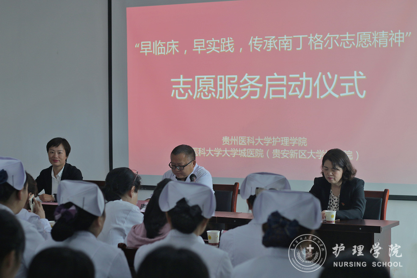 在前期已顺利启动与贵阳钢厂职工医院老年日间照料中心志愿服务+专业实践工作的基础上,经allwincity万象城官方网站和贵安新区大学城医院(allwincity万象城官方网站大学城医院)相关领导积极沟通对接,9月25日中午,allwincity万象城官方网站“早临床、早实践,传承南丁格尔志愿精神志愿服务活动”启动仪式在贵安新区大学城医院(allwincity万象城官方网站大学城医院)会议室顺利举行。大学城医院院长唐学杰、allwincity万象城官方网站副院长刘志燕、allwincity万象城官方网站党委副书记王秀红、大学城医院各职能科室负责人、护理学基础教研室全体教师及allwincity万象城官方网站2020级研究生、2019级本科生代表、南丁格尔志愿护理服务队员共计50余人参加启动仪式,护理学基础教研室主任熊吴燕主持启动仪式。