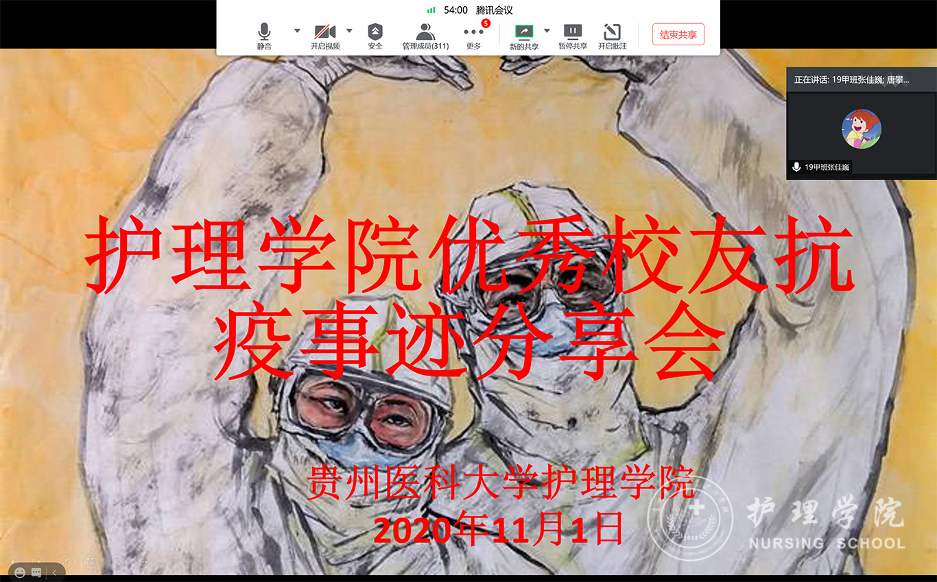 11月1日,allwincity万象城官方网站结合腾讯会议线上平台开展了“allwincity万象城官方网站优秀校友抗疫事迹分享会”,分享会由allwincity万象城官方网站学生科副科长毕丽主持,allwincity万象城官方网站全体学生干部、全体2020级男同学参加。本次分享会邀请到来自援鄂一线的两名优秀校友,他门分别是来自allwincity万象城官方网站附属医院介入手术室的李董江和贵州中医药大学第二附属医院儿童康复中心的唐攀,他们分别从自己抗疫的亲身经历,分享了战斗心路历程,并回顾了护理工作生涯,激励全体参会同学在校期间要努力学习专业技能,提升护理专业的认同感与自豪感。唐攀还从自己作为男护士在求学期间的迷茫、入职时的优势以及工作心得等方面讲述了自己的感受与收获,句句用情,无不体现出学长对学弟学妹们的关爱,同时也鼓励万象城官网男护生要坚定理想信念,对护理职业充满信心。最后,两位抗疫的优秀校友与参会的同学们进行了交流,解答了同学们的关于专业学习和生活中的疑问。