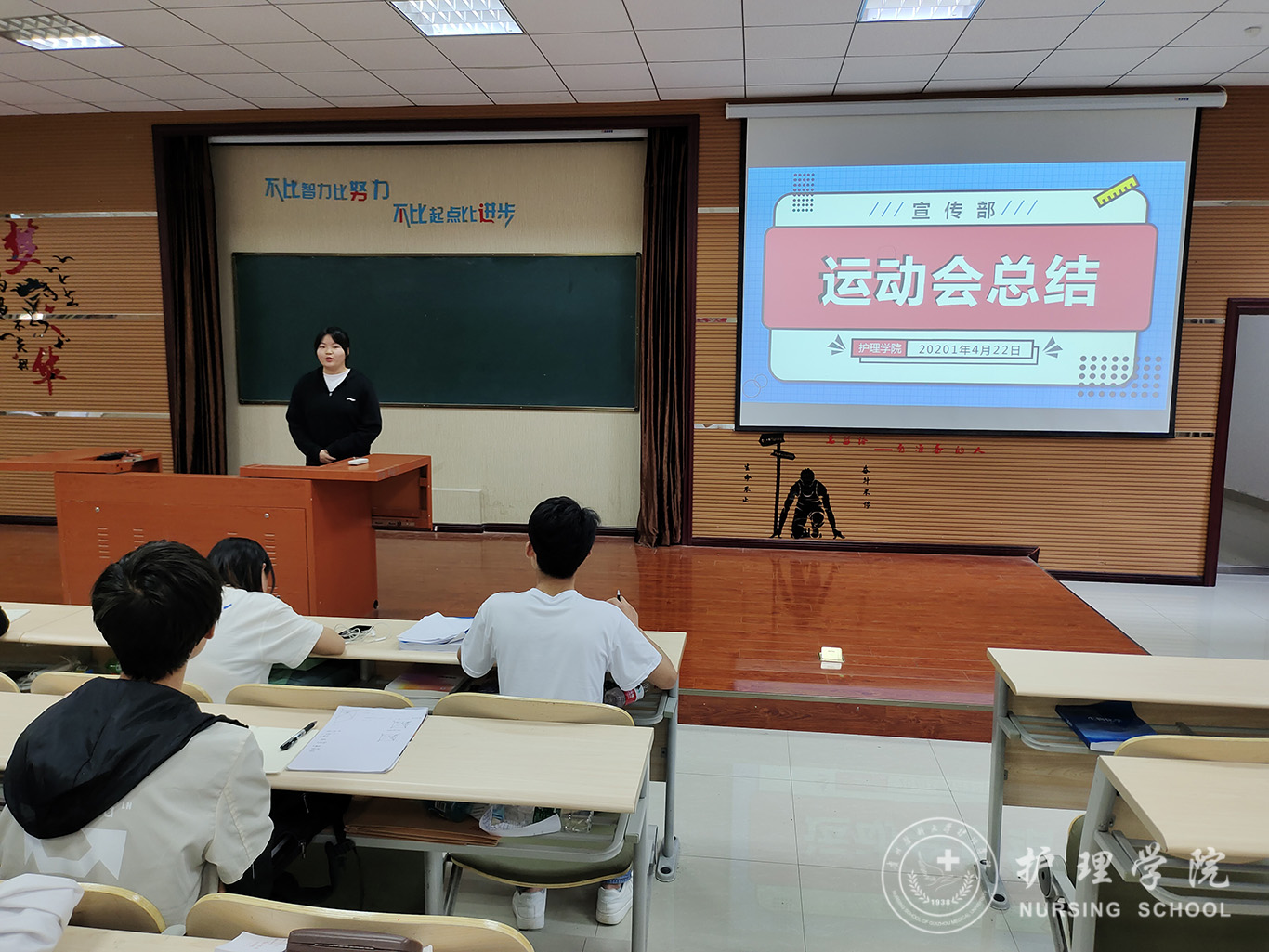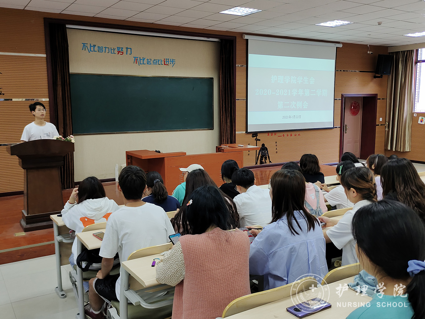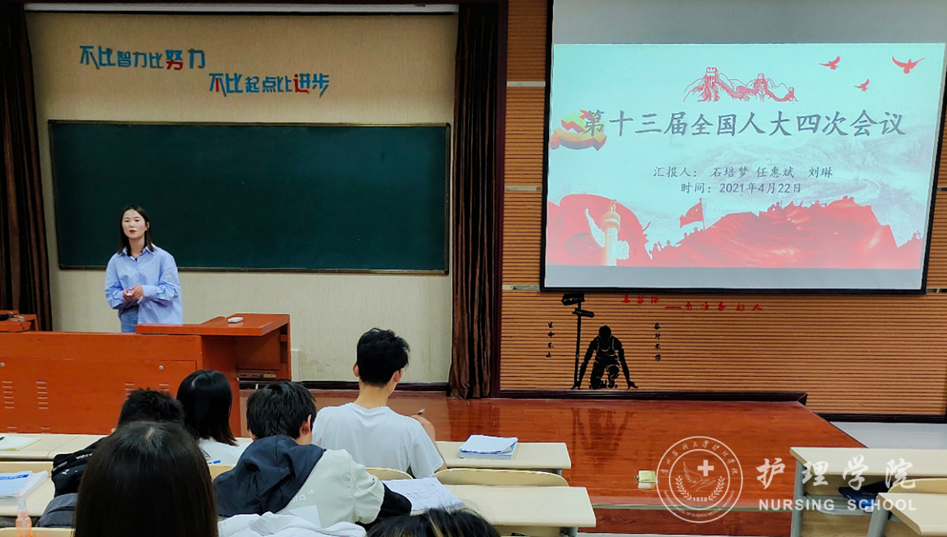 本次会议共分为四项议程。第一项,由文体部主持了第十三届全国人大四次会议相关政治理论学习。提出在全面建设社会主义现代化国家新征程上,我们要更加紧密地团结在以习近平同志为核心的党中央周围,增强“四个意识”、坚定“四个自信”、做到“两个维护”,把宪法法律赋予的职责履行好,以优异成绩庆祝中国共产党成立100周年,为实现中华民族伟大复兴中国梦不懈奋斗!第二项,各部门对第四十届校运会中的工作内容、工作方法、工作总结等做出汇报。第三项,由副主席罗茂龙对五月护士节授帽仪式,五四主题团日活动等做工作安排。并提出学生会与各班级之间应增进沟通交流,以便更好的为同学服务。第四项,刘妍老师做总结,她肯定了大家在运动会中的辛勤付出,同时也要求同学们要在经验教训中学会成长,努力成为一个有思想、有作为、有修养的学生干部。