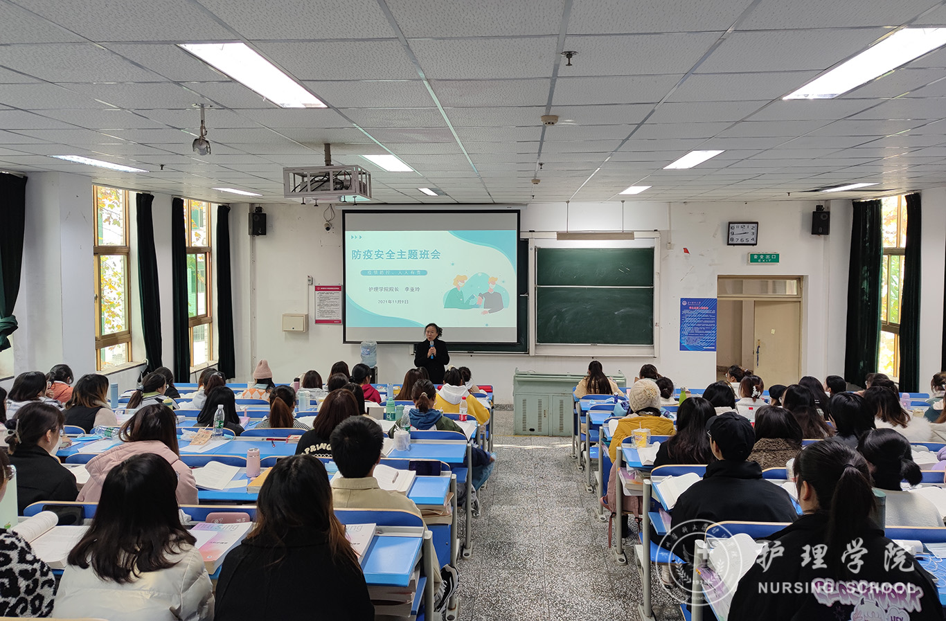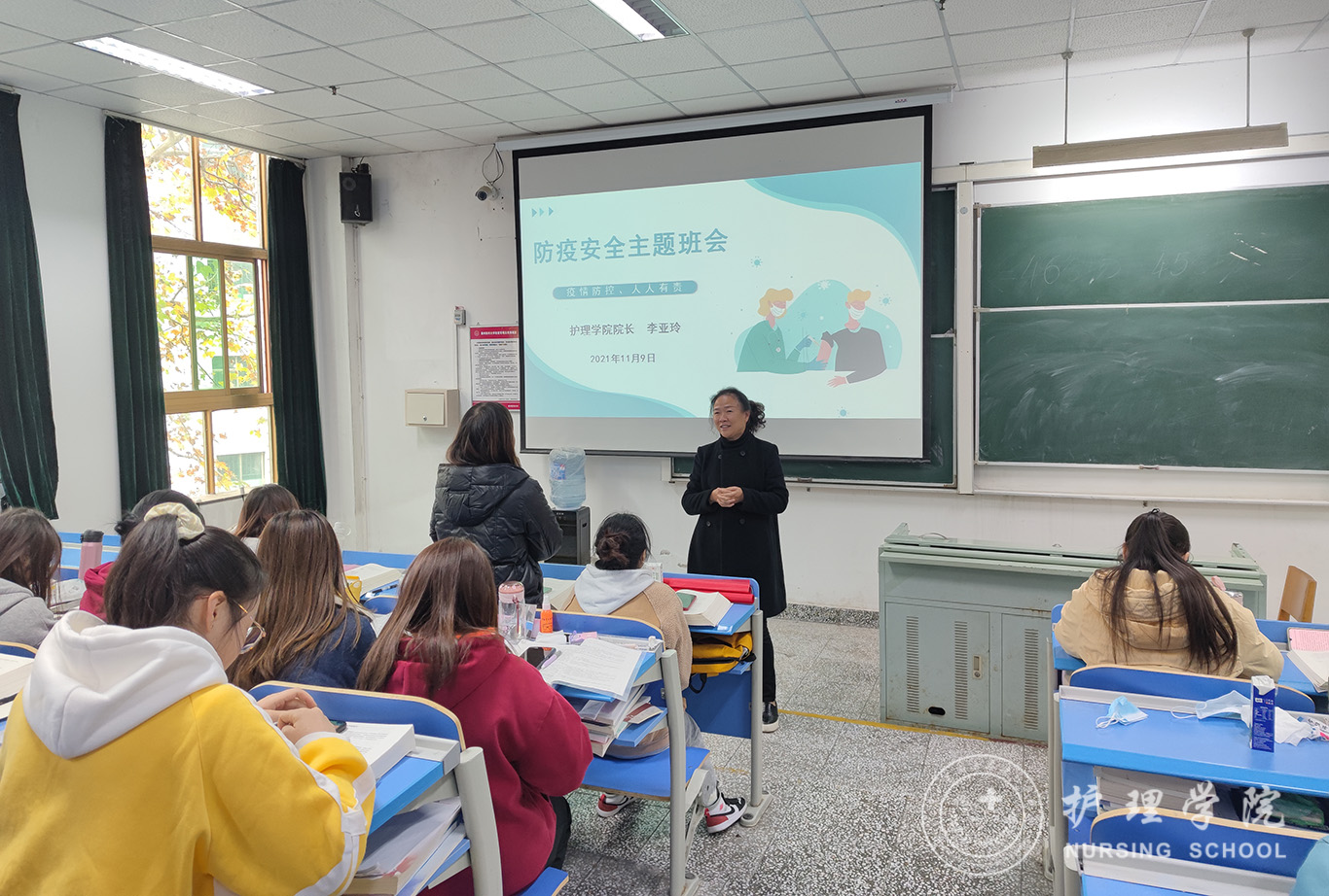 11月9日,为深入开展防疫安全教育,贯彻落实防疫常态化、防护生活化的战略目标。allwincity万象城官方网站2019级护理学丙班组织开展一次特别的主题班会,诚挚邀请allwincity万象城官方网站院长李亚玲以“防疫安全、人人有责”为题为全体同学讲授一堂生动有趣的思政课,辅导员杨叶卿参加。