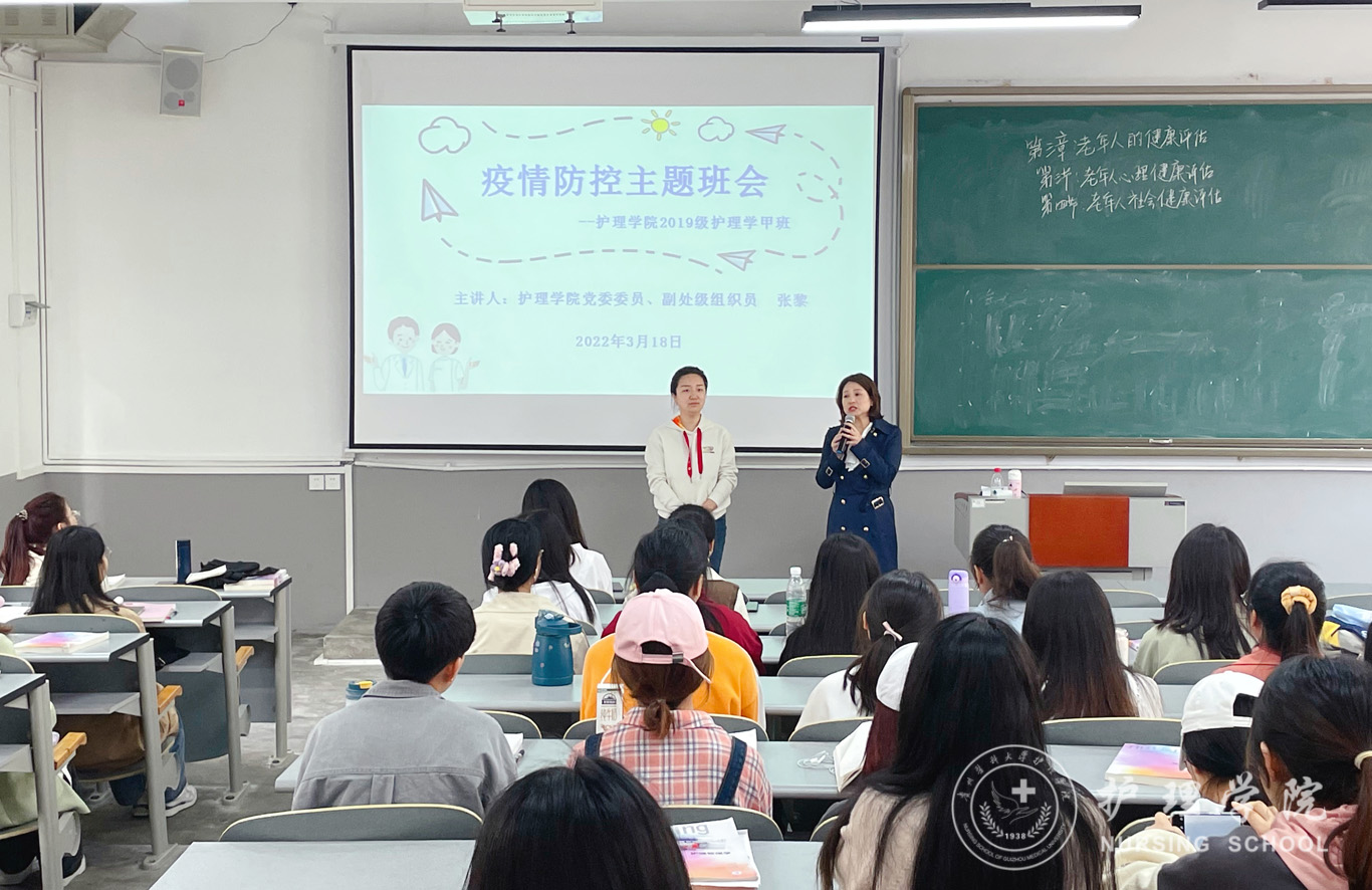3月18日,因近期疫情反弹,我省遵义市务川县及周边省市连续出现新冠肺炎确诊病例和无症状感染者病例,根据疫情防控工作需要,为了更有效地抗击疫情,增强学生疫情防控意识,有效预防新冠肺炎“卷土重来”,保护好自己和他人身体健康,allwincity万象城官方网站党委委员、副处级组织员张黎于北校区普教7教室对2019级护理学甲班进行随堂听课并召开“疫情防控”主题班会。班会由辅导员杨叶卿主持,全体同学参加。