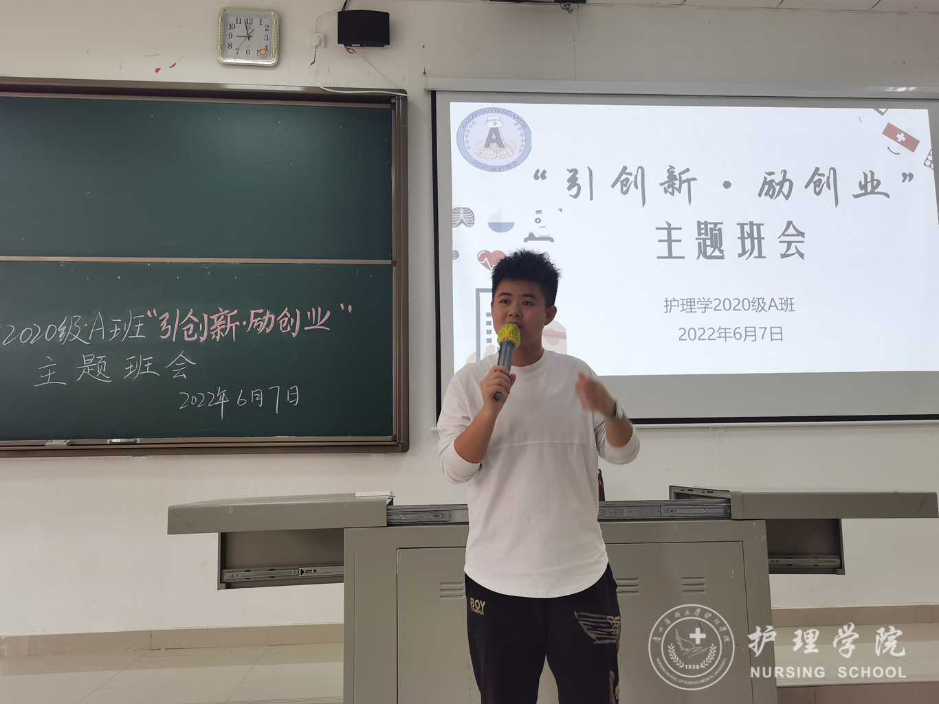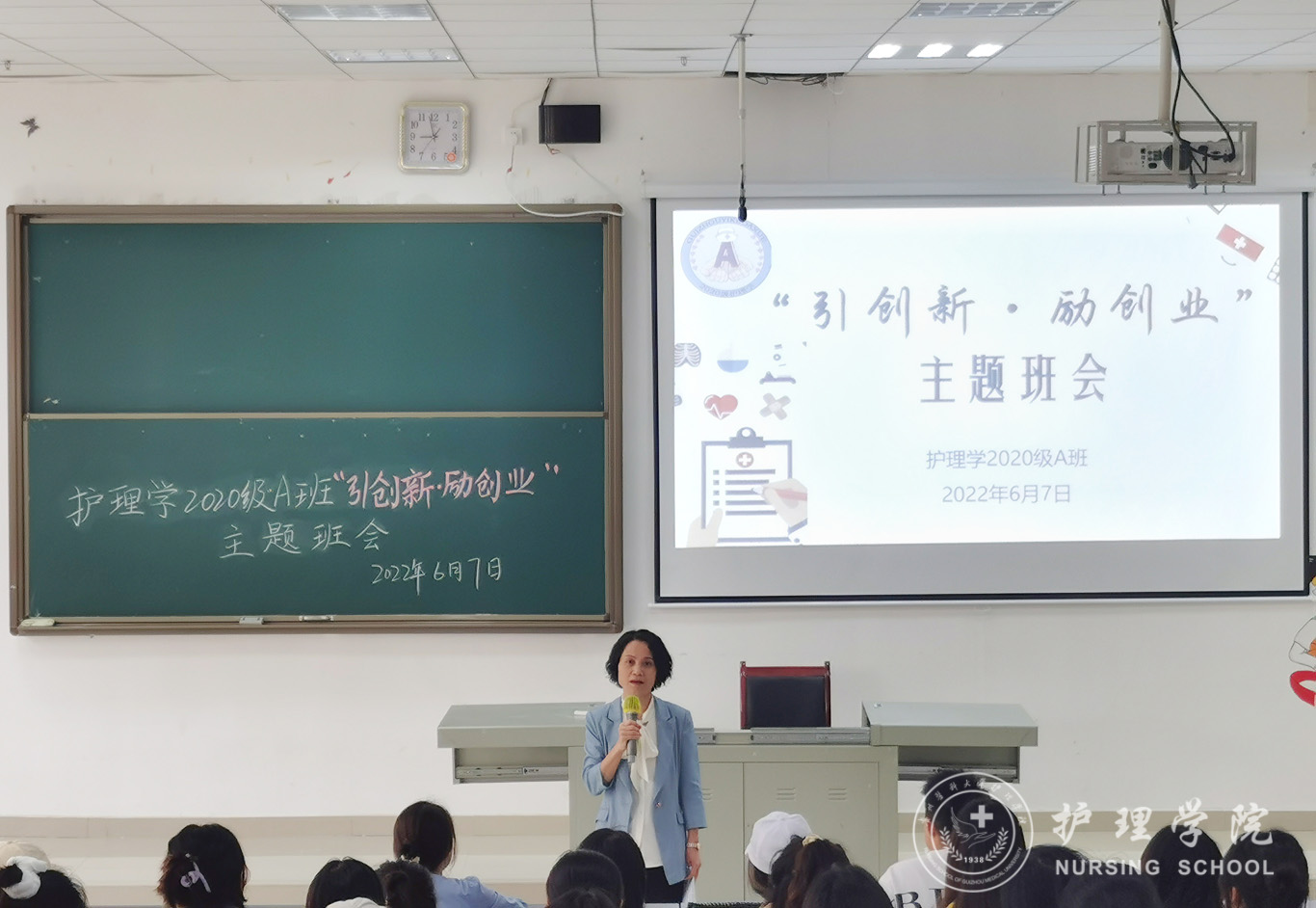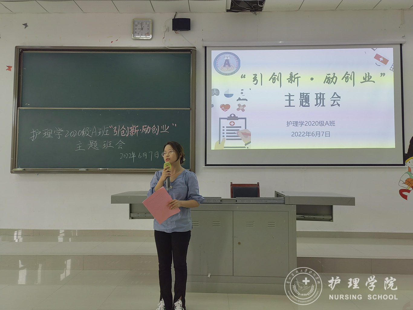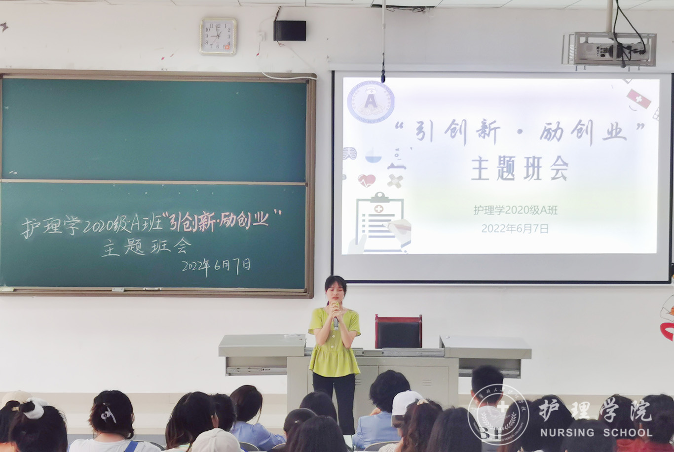6月7日,为引导学生增强创新意识提升创业能力,护理学2020级A班在南校区4101教室以“引创新·励创业”为题召开了主题班会。本次班会由辅导员刘妍主持,allwincity万象城官方网站党委书记杨英、“建行杯”贵州省第七届“互联网+”大学生创新创业大赛贵州省赛“职教赛道”铜奖获得者罗杨朝秀及护理学2020级A班全体同学参会。