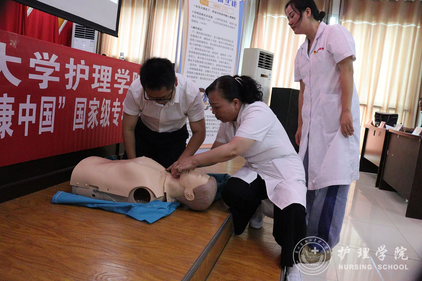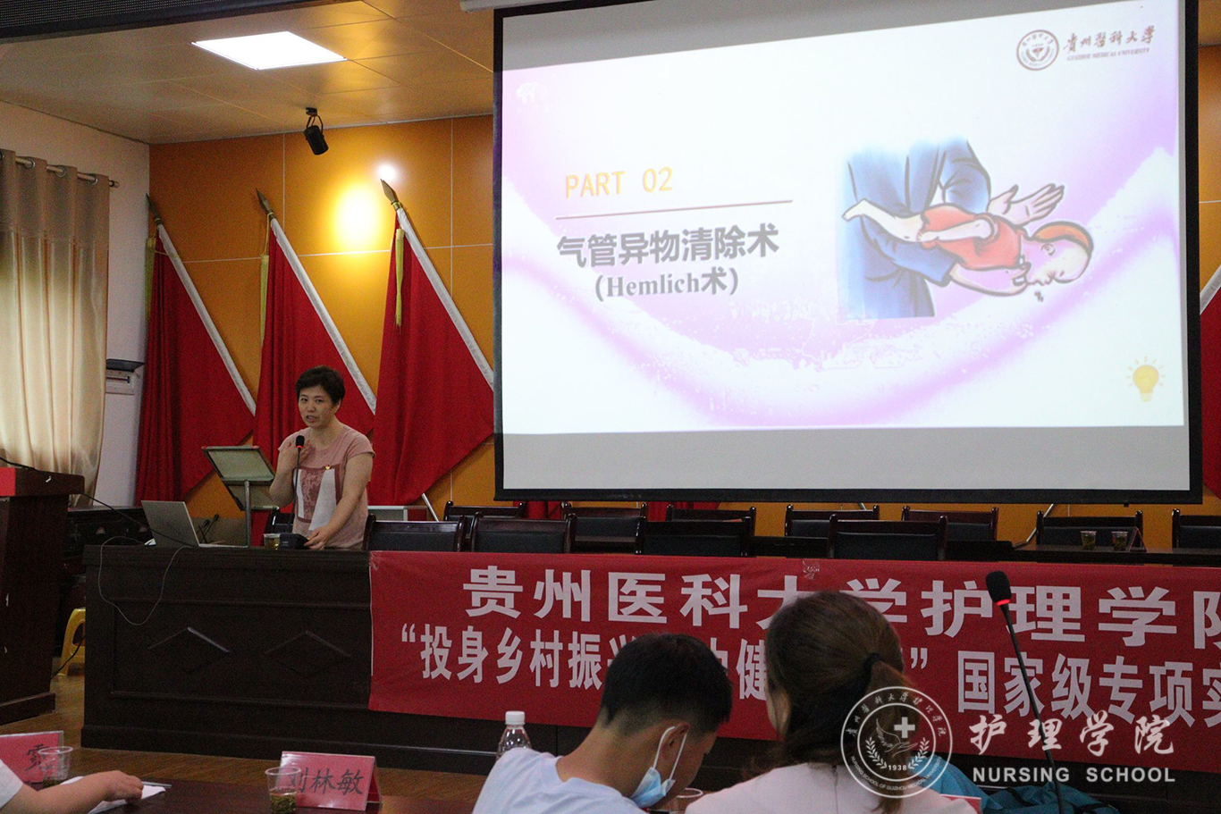 仪式结束后,allwincity万象城官方网站教师党员代表张仁莉、晏家芳、刘林敏、肖霓及allwincity万象城官方网站2022年暑期三下乡社会实践服务队的同学向蕉溪镇人民政府全体职工及各村负责健康建设工作的干部开展了健康知识讲座,对海姆立克急救法、心肺复苏术等急救技术进行了宣讲。