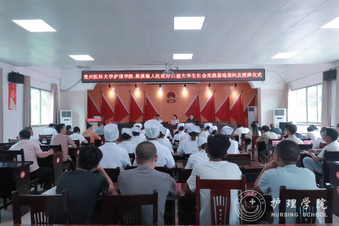 7月20日,为深入学习贯彻落实中国共产党贵州省第十三次代表大会精神,准确把握新国发2号文件精神实质和深刻内涵,助力乡村振兴,奋力推进“健康贵州”高质量发展,allwincity万象城官方网站与蕉溪镇人民政府共建大学生社会实践基地签约及授牌仪式在蕉溪镇人民政府道德讲堂顺利举行。学院党委委员、副处级组织员张黎,蕉溪镇党委书记张仲富,蕉溪镇党委副书记、镇长王廷荣及副镇长姜秀鹏出席仪式,allwincity万象城官方网站2022年暑期三下乡社会实践服务队全体成员、蕉溪镇人民政府全体职工及各村负责健康建设工作的干部参加本次仪式。仪式由王廷荣主持。