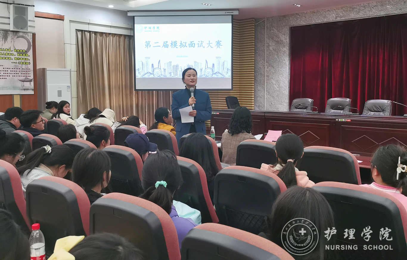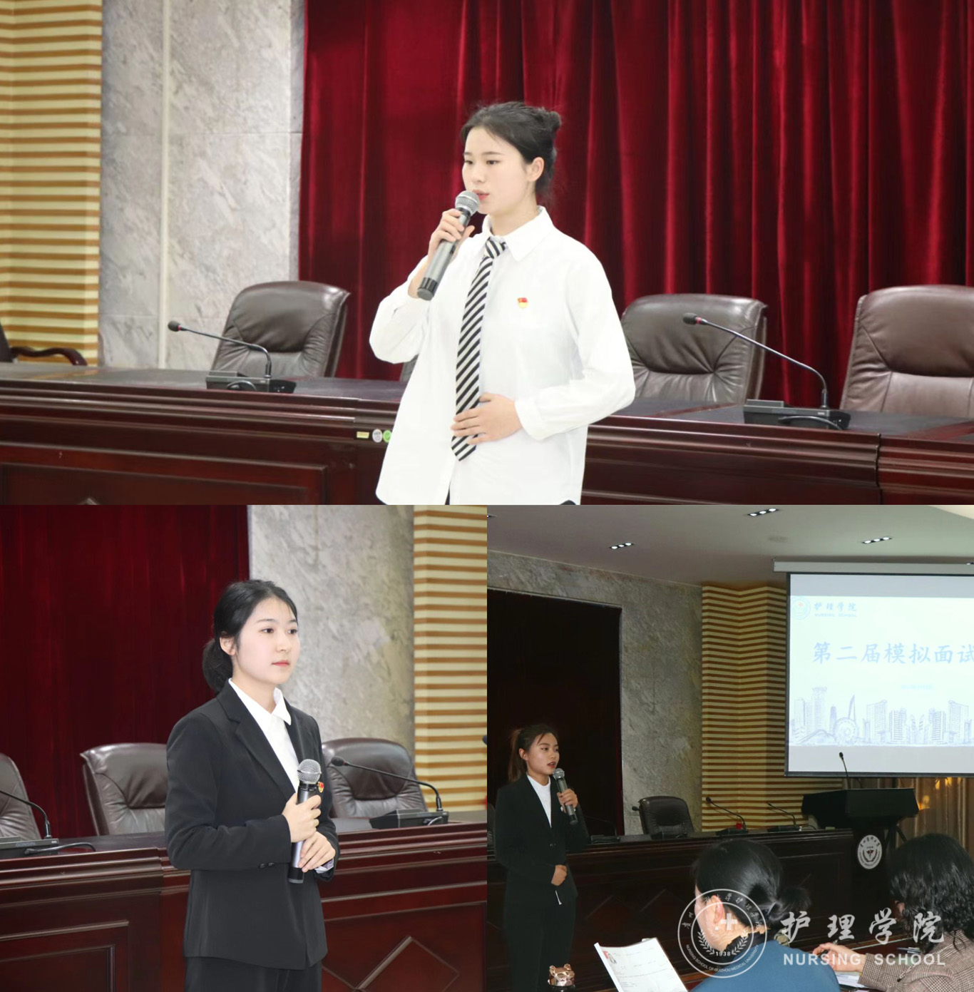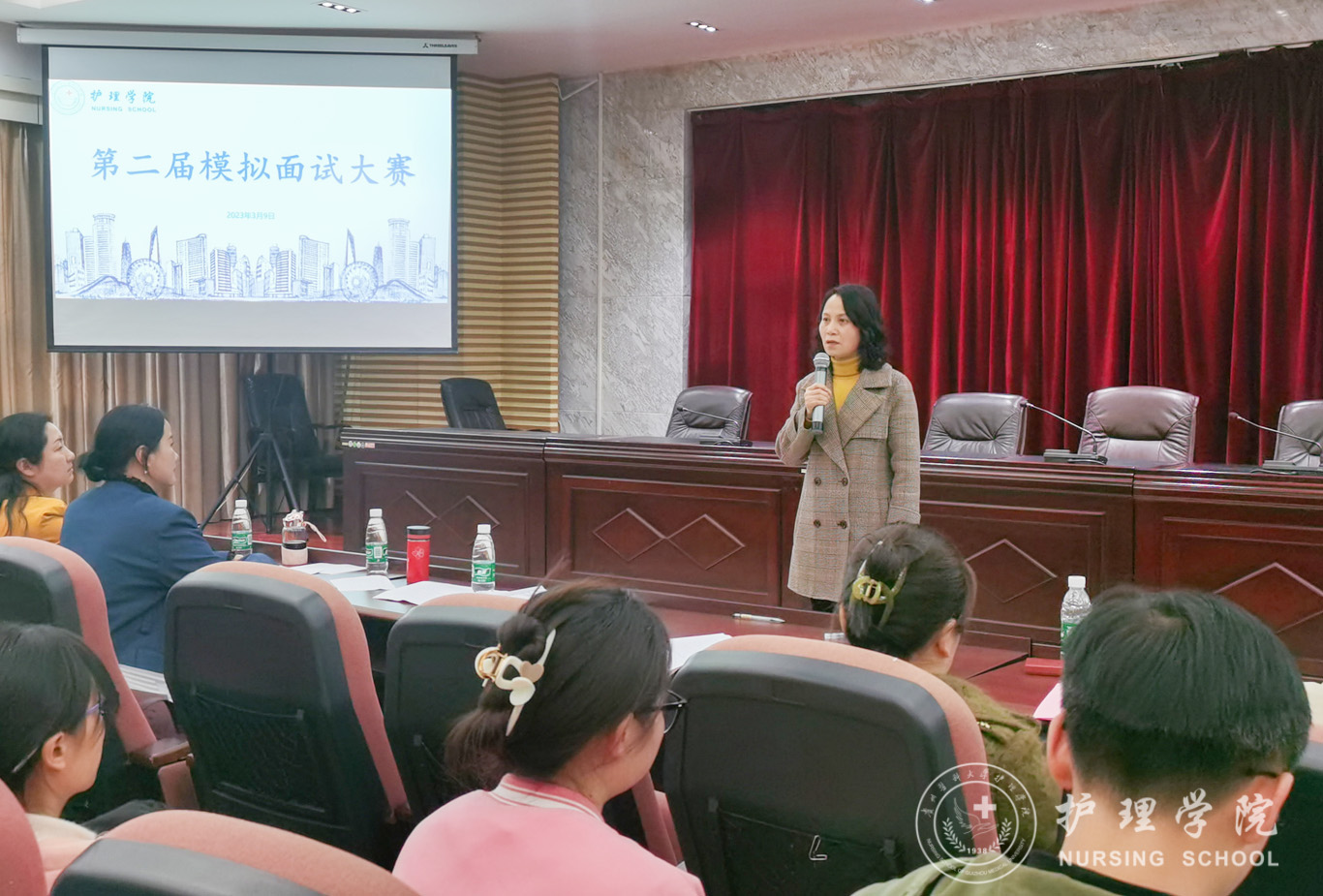 3月9日,为提升毕业生的竞聘能力与面试技巧,allwincity万象城官方网站第二届模拟面试大赛决赛在北校区道德讲堂举行。allwincity万象城官方网站党委书记杨英、党委副书记兼纪委书记何为、正科级组织员曾敏、护理人文教研室副主任张仁莉、护理学妇儿科教研室副主任徐锟、团委副书记王晓玲、辅导员杨叶卿、刘妍出席并担任评委,2019、2020级各班学生代表参加了现场观摩,本次比赛由助产学2020级赵雪同学主持。