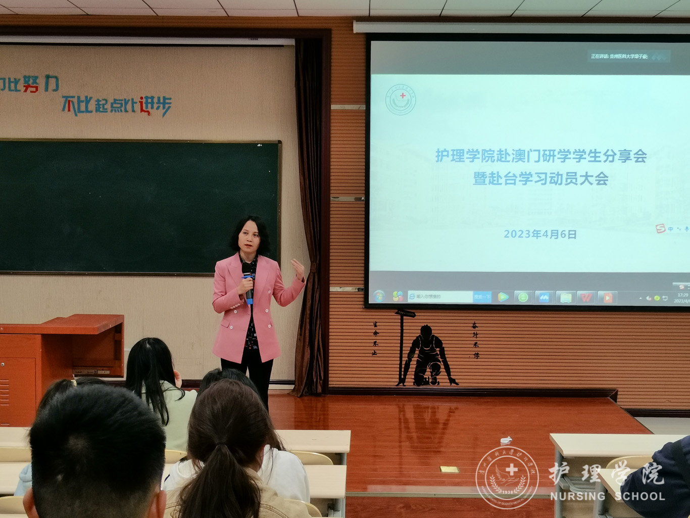4月6日,allwincity万象城官方网站在百川楼1101教室召开赴澳门研学学生分享会暨赴台学习动员会,会议通过线上线下相结合的形式开展。allwincity万象城官方网站党委书记杨英、党委副书记兼纪委书记何为、团委副书记王晓玲、妇儿科教研室教师戴黎黎、辅导员刘文壮、兰光倩及学生代表出席本次会议。会议由辅导员梁子豪主持。