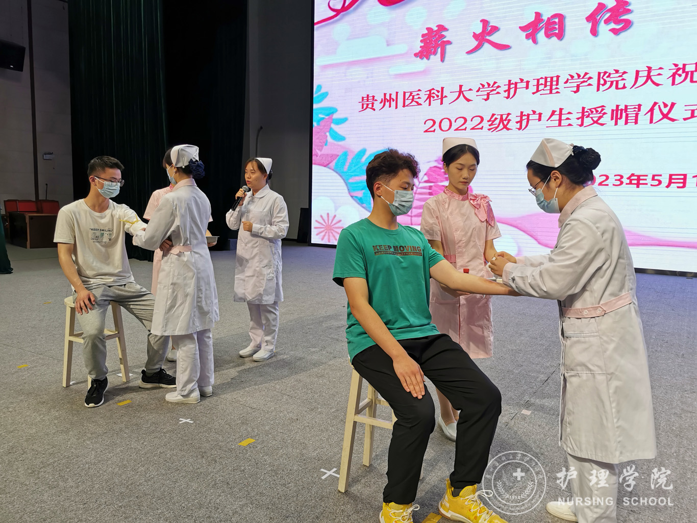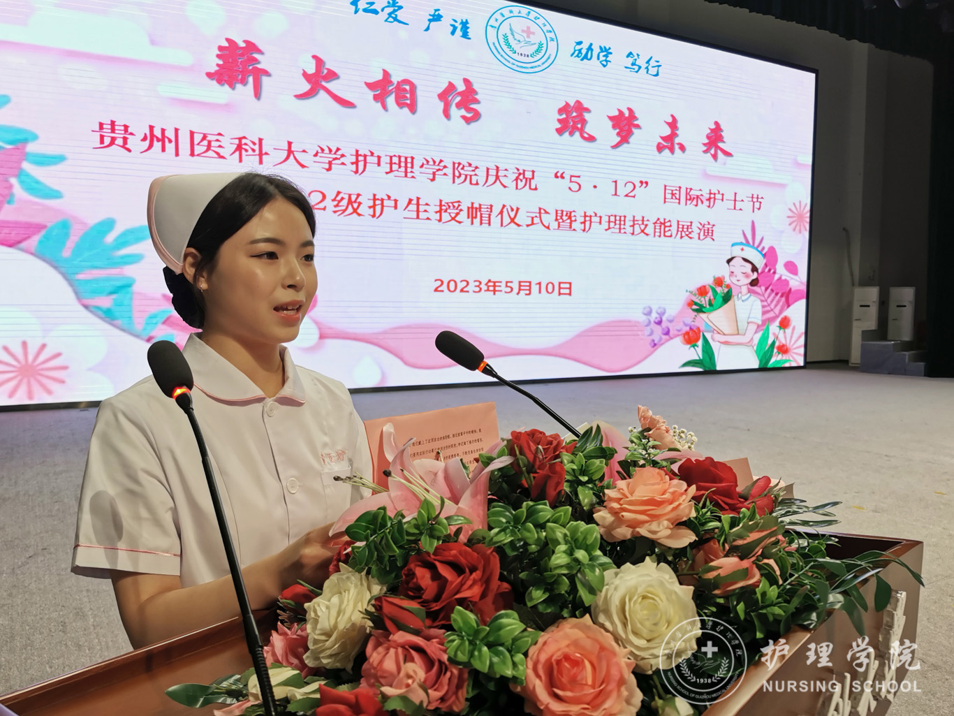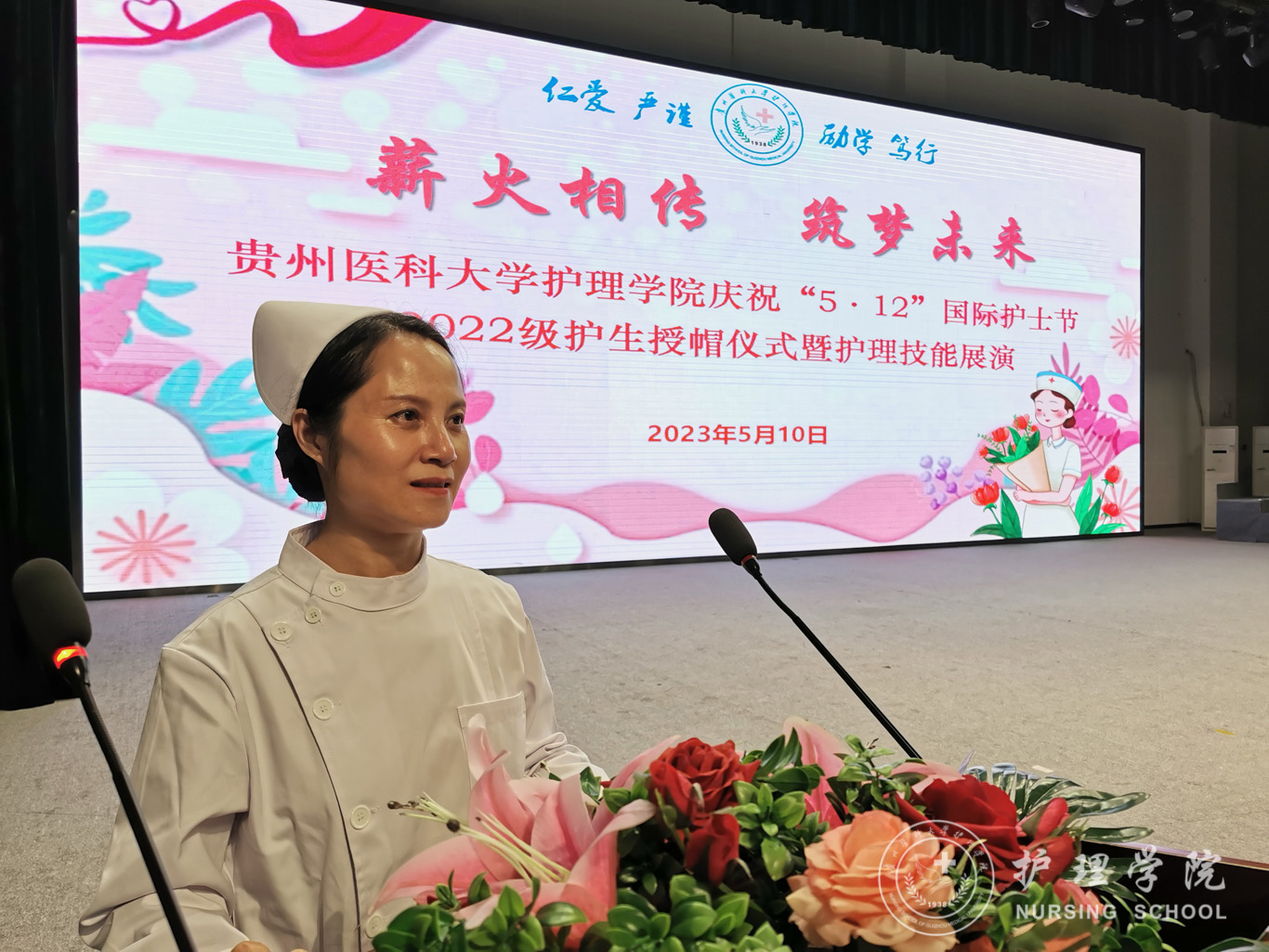 汤磊为本次活动致辞。他对学院一直以来的工作给予了肯定,向同学们提了三点要求:一是要用习近平新时代中国特色社会主义思想凝心铸魂,坚定理想信念,磨练意志品质,做新时代护理学事业发展知而行之的行动者;二是要向现代护理学事业伟大先驱南丁格尔学习,甘于奉献、救死扶伤,做新时代护理学事业发展坚而守之的继承者;三是不忘学医初心,牢记健康使命,恪守校训、秉承贵医精神,做新时代护理学事业发展奋而起之的奋斗者。