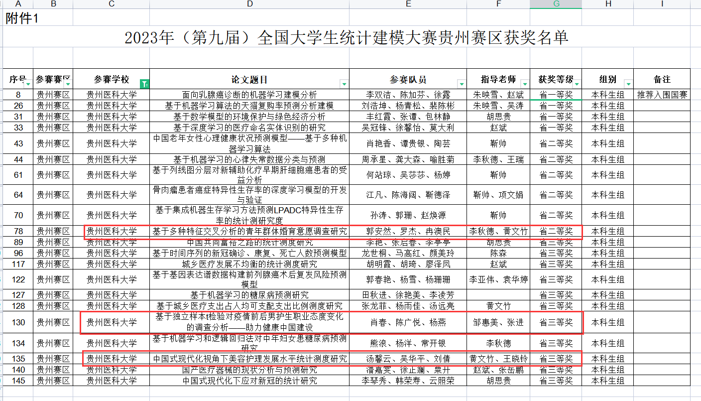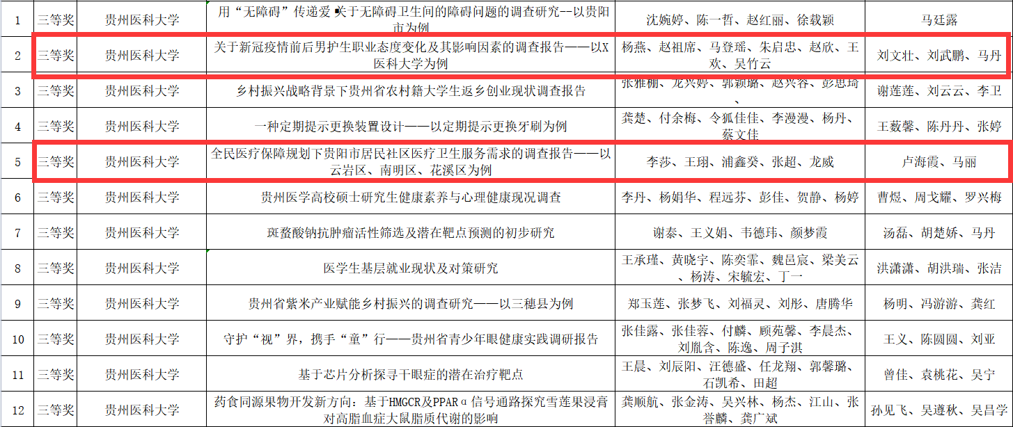 在第十八届“挑战杯”全国大学生课外学术科技竞赛中,万象城官网推出32支队伍参加了校赛,经过层层选拔,在贵州省终审决赛中,由刘文壮、刘武鹏、马丹指导的《关于疫情前后男护生职业态度变化及其影响因素的调查报告——以X医科大学为例》荣获省级三等奖,成员:杨燕、赵祖席、马登瑶、朱启忠、赵欣、王欢、吴竹云;由卢海霞、马丽指导的《全民医疗保障规划下贵阳市居民社区医疗卫生服务需求的调查报告——以云岩区、南明区、花溪区为例》荣获省级三等奖,成员:李莎、王珝、浦鑫癸、张超、龙威。