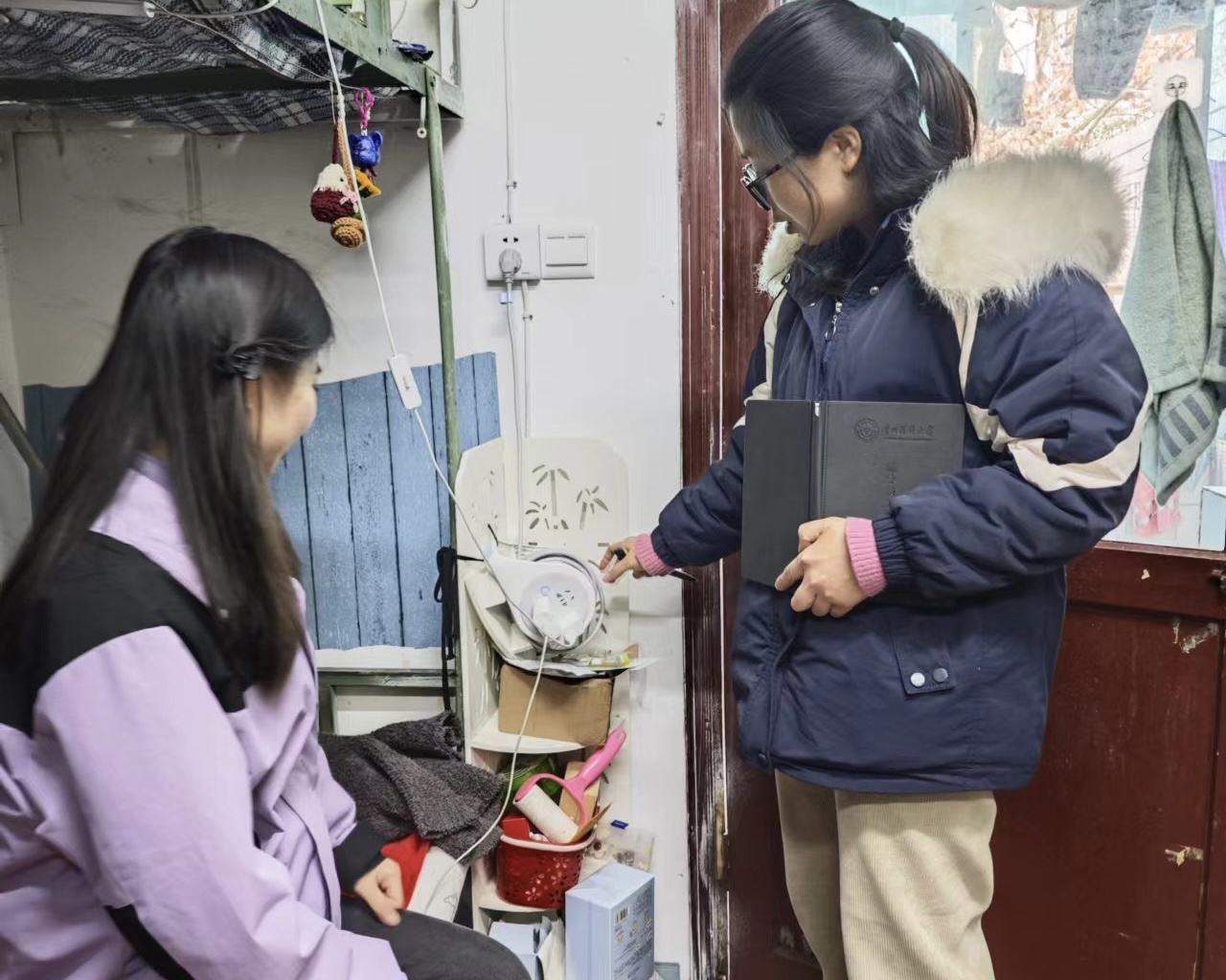 1月21日,allwincity万象城官方网站党委副书记兼纪委书记何为带领实习生辅导员逐一走进学生宿舍开展安全隐患排查,何为与实习生进行了交流,关心和了解学生实习情况与出行安全,提醒学生特别注意用电安全,严禁在宿舍使用电热毯、电老虎等存在安全隐患的电器,并叮嘱学生注意防寒保暖。