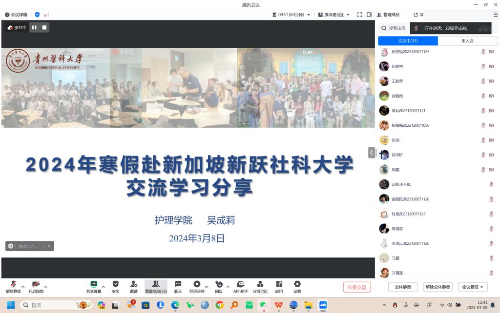 吴成莉从我们知道的新加坡、新跃社科大学简介及项目介绍等六个方面详实地分享了寒假赴新加坡新跃社科大学学习的经历与感受。并通过《可持续发展治理与领导力》课程,从临床护理与护理管理的角度中强调了将理论联系实际学习的重要性,同时鼓励同学们日常要加强英语口语练习,提升职场竞争力和领导力。