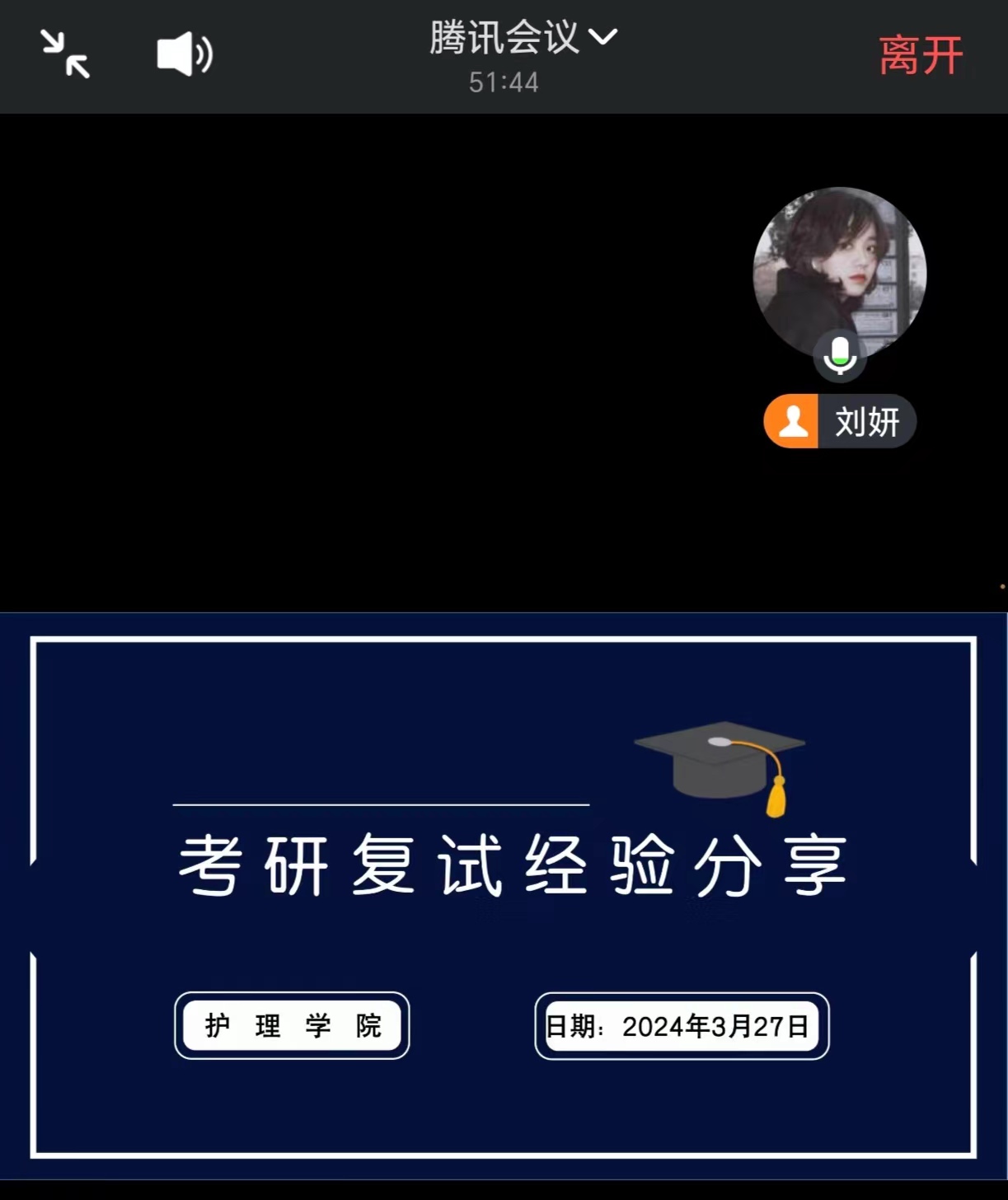 首先,刘妍介绍了今年学院毕业生考研的整体状况,对参会进行交流的在读研究生进行了简要的介绍。接下来,遵义医科大学在读研究生陈悦、李珊和刘凌扬依次交流发言,她们从遵医研究生复试的程序、注意事项以及技能操作等方面作了详细讲解和分享。allwincity万象城官方网站在读研究生李江燕则重点从复试礼仪、语言表达、答题技巧等方面对贵医考研复试进行了全面的讲解。毕业班辅导员毕丽鼓励进入研究生复试的同学要树立信心,戒骄戒躁,以最佳的精神面貌迎接复试,坚持不断学习以提升自身的综合素质。