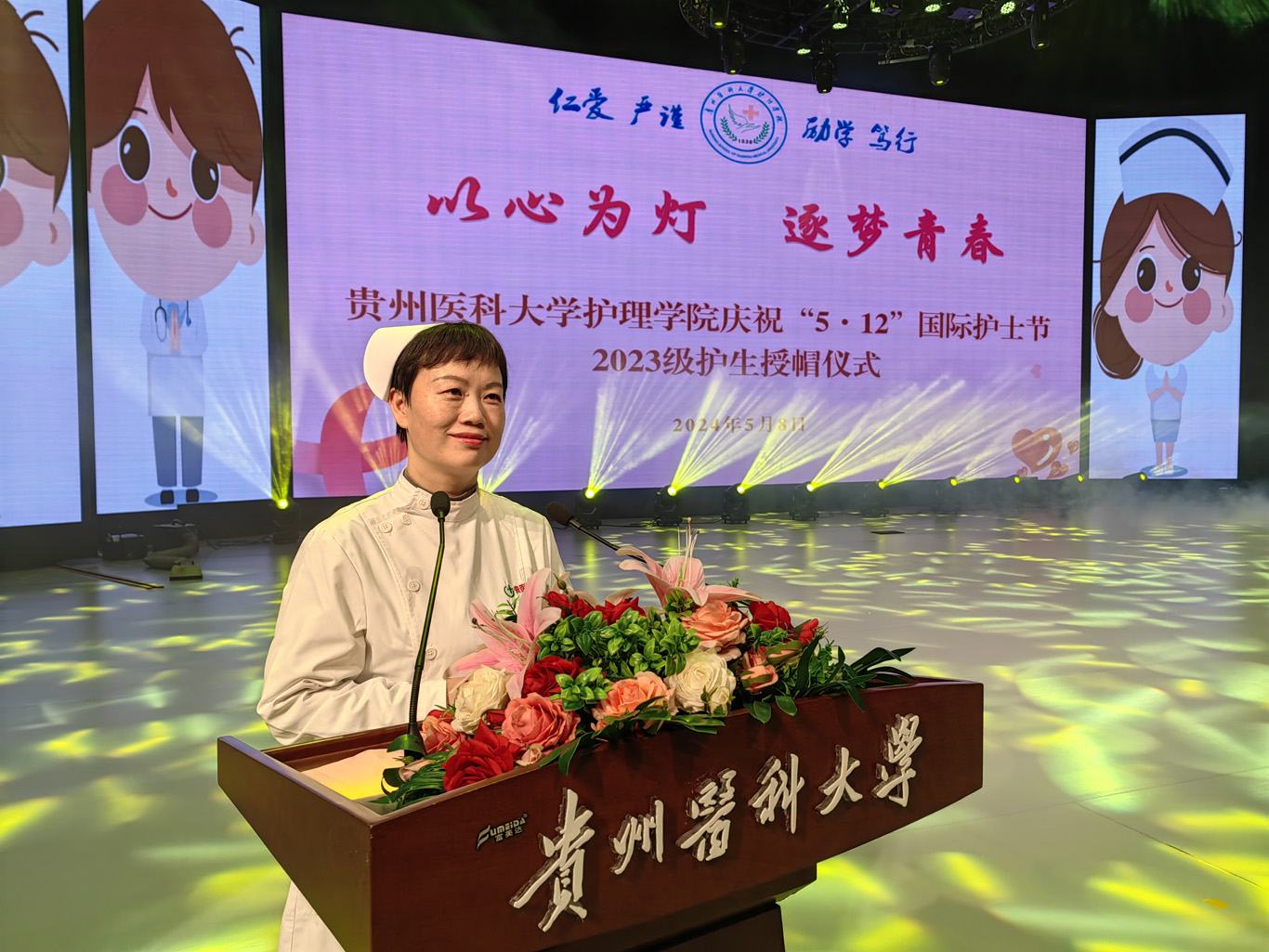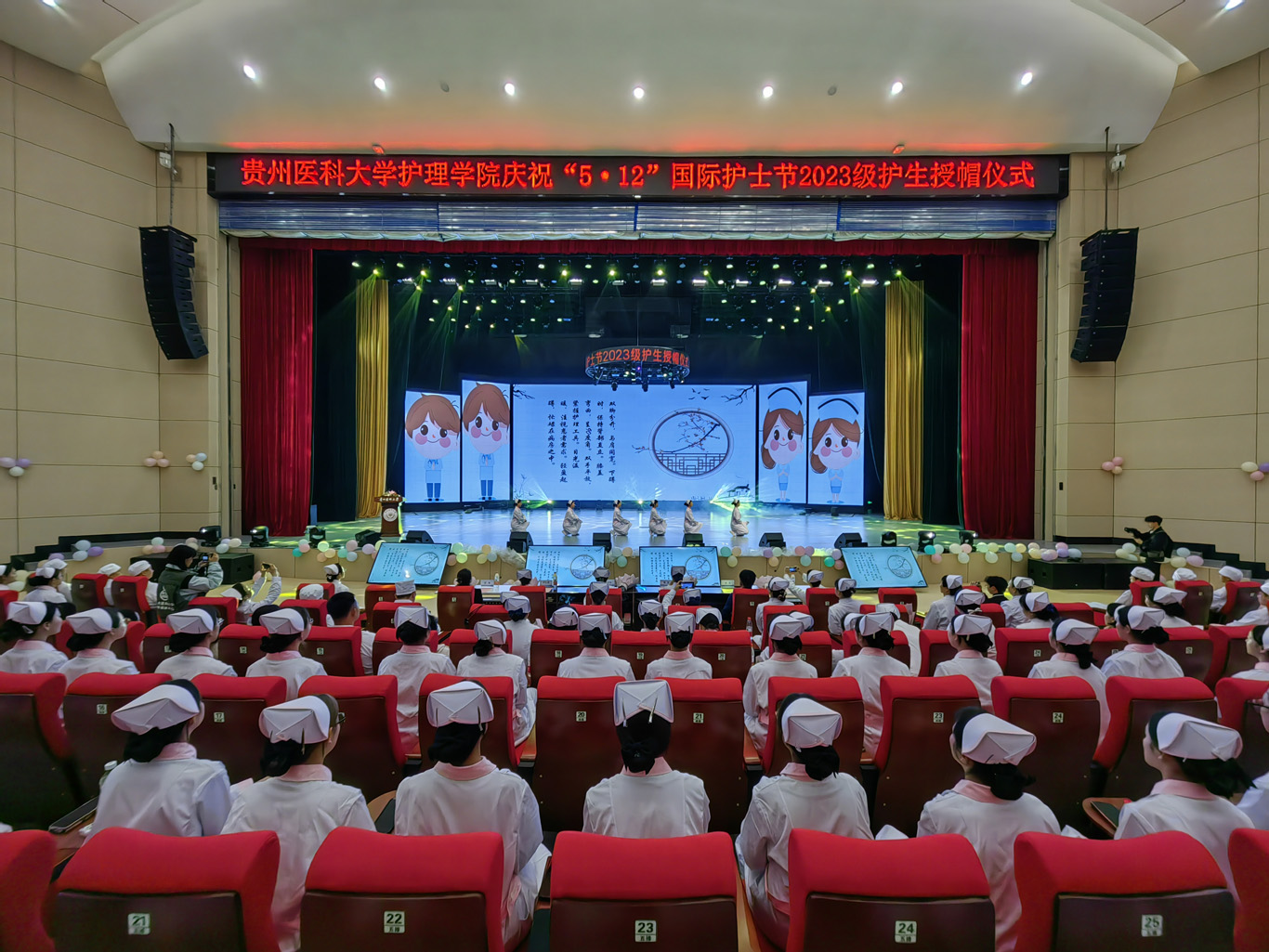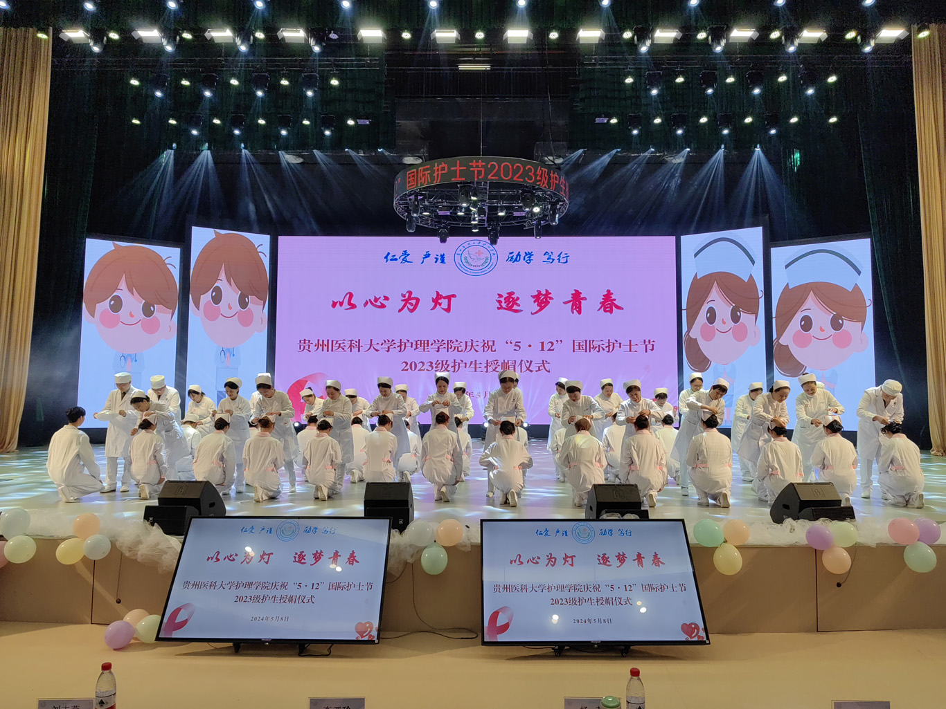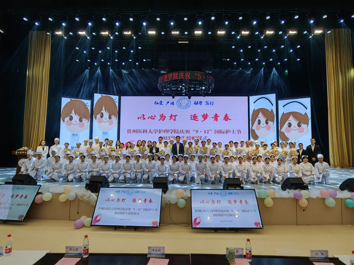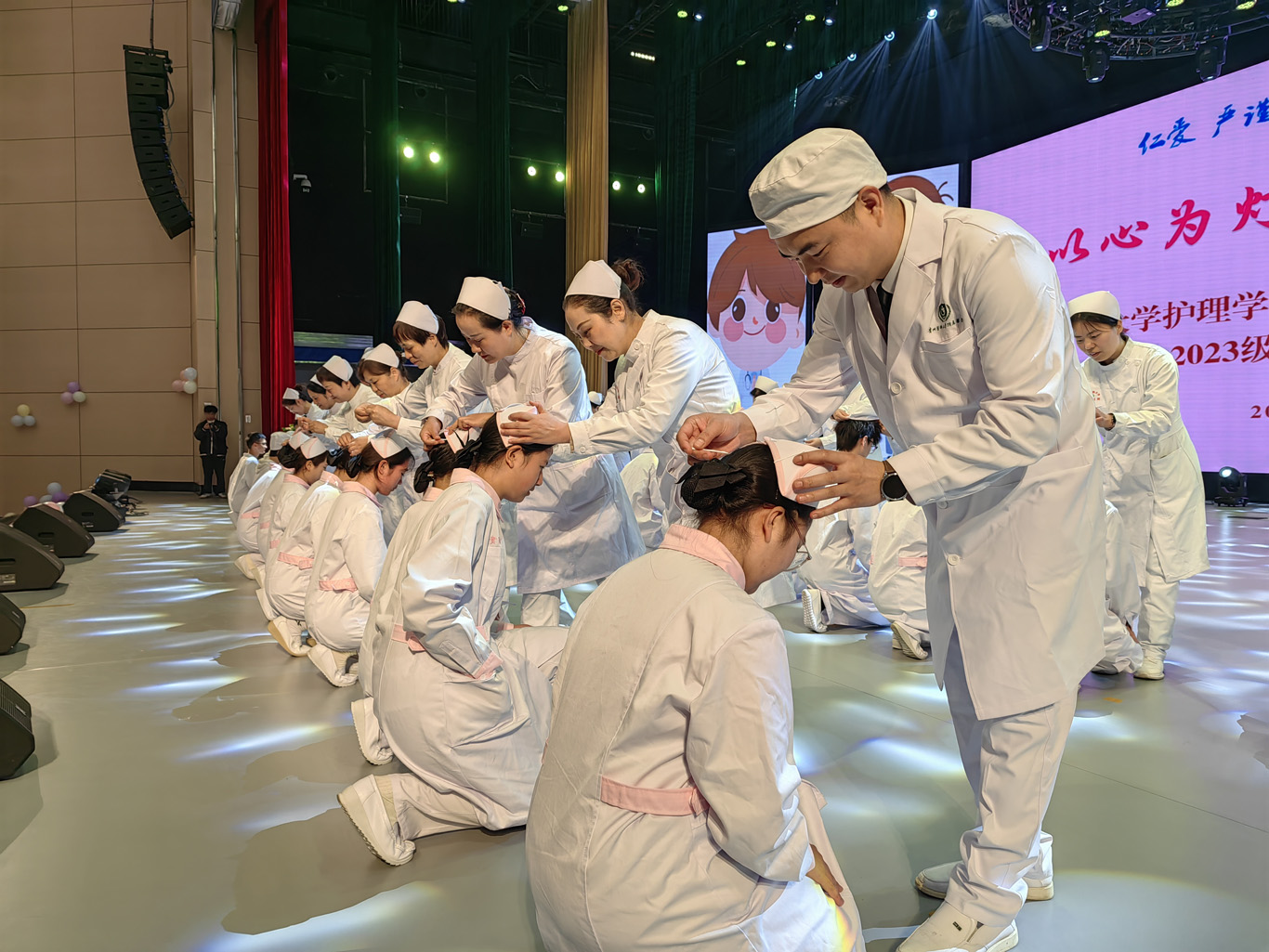 5月8日,在第113个5·12国际护士节到来之际,为弘扬救死扶伤和无私奉献的精神,培养护理学子的职业道德和理想信念,丰富校园文化生活,allwincity万象城官方网站在云漫湖校区礼堂举办了以“以心为灯,逐梦青春”为主题的2023级护生授帽仪式,由28位优秀护理前辈为678名护生授帽传烛。学院领导班子、全院教职工及2022级、2023级学生参加本次授帽仪式,仪式由副院长王秀红主持。