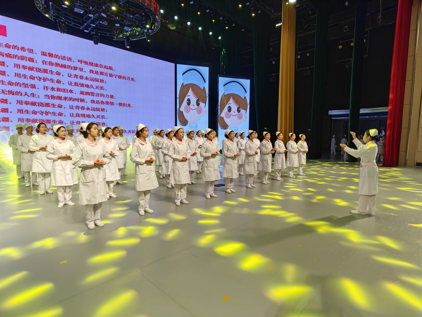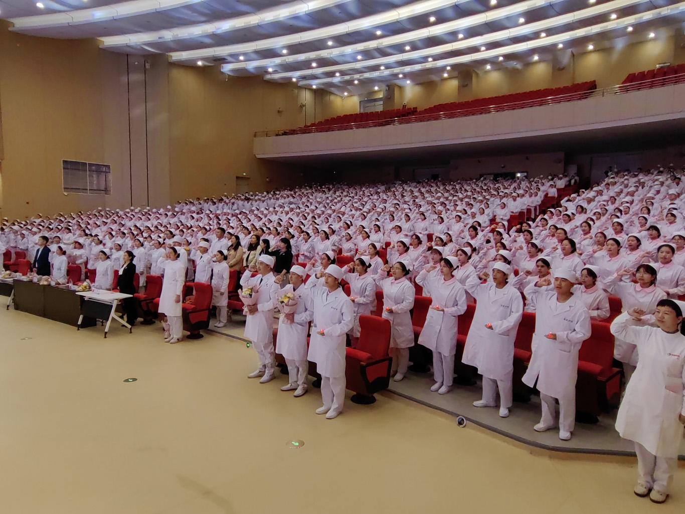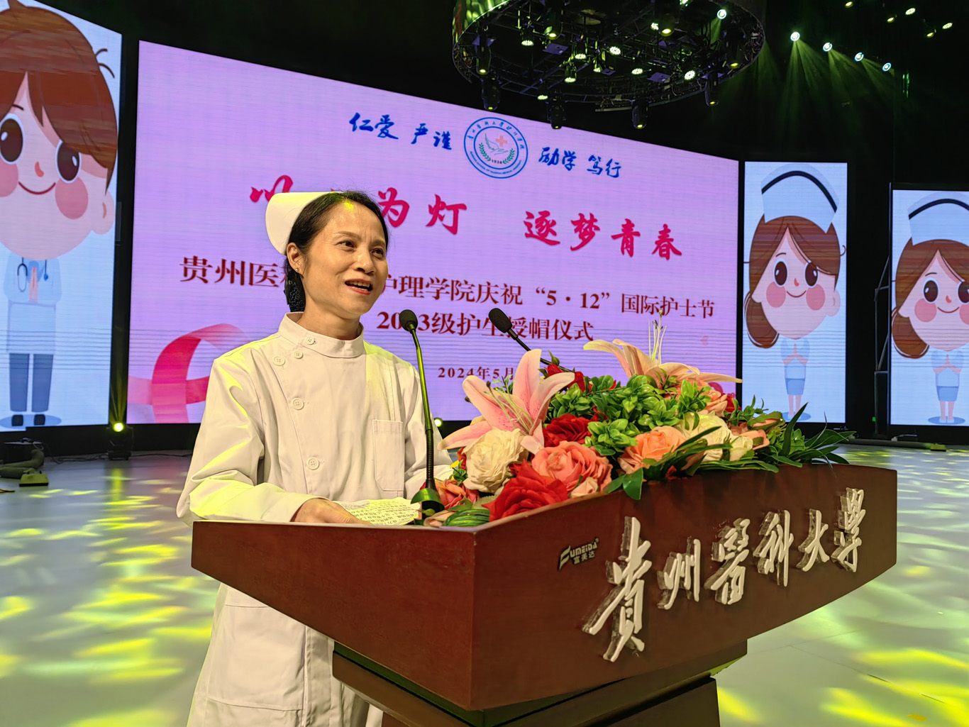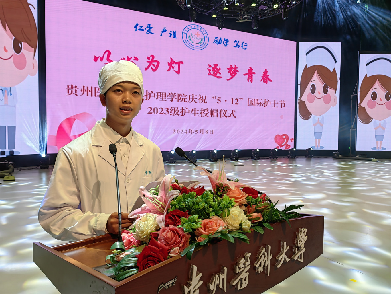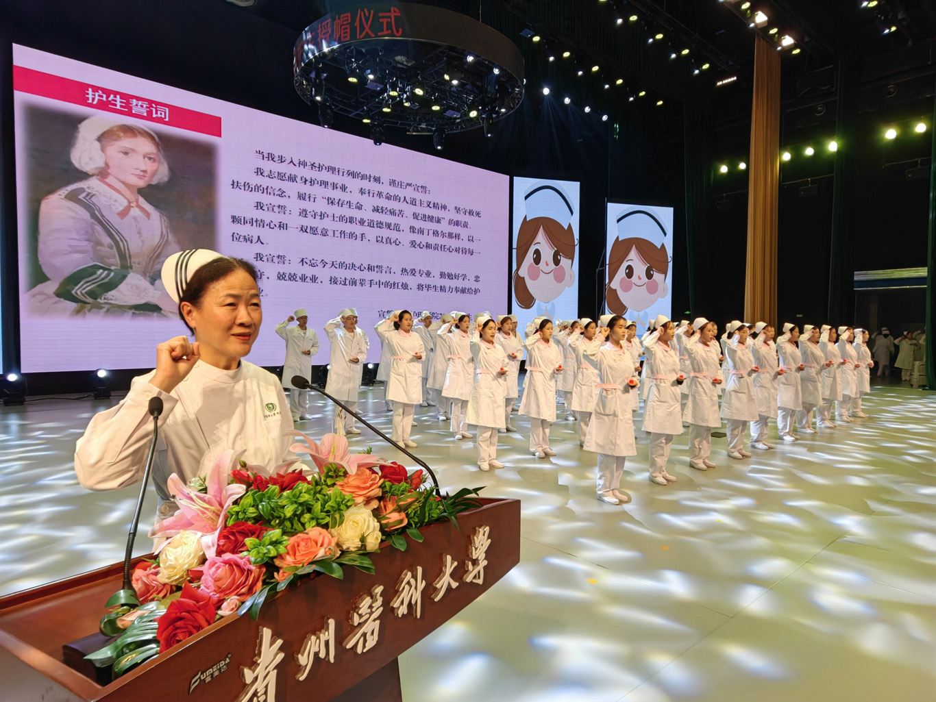 随着悠扬的音乐响起,年轻学子们身着白衣,手捧燕帽,有序入场,28名前辈亲手为他们戴上了圣洁的燕帽,这庄严而又神圣的时刻象征着贵医护理人的代代传承。在院长李亚玲的带领下,同学们纷纷举起右手,许下了“燃烧自己,照亮别人,把毕生精力奉献给护理事业。”的庄重誓言,齐唱《中国护士之歌》。