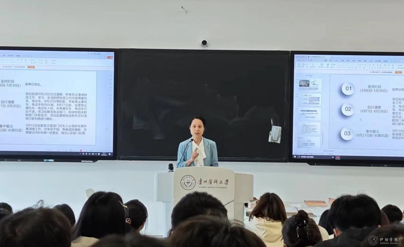 6月4日,护理学2023级2班在云漫湖校区酬勤楼L111教室组织开展“云漫湖校区禁摩禁电”主题班会,班会由辅导员李茂盛主持,学院党委书记杨英参会并讲话。