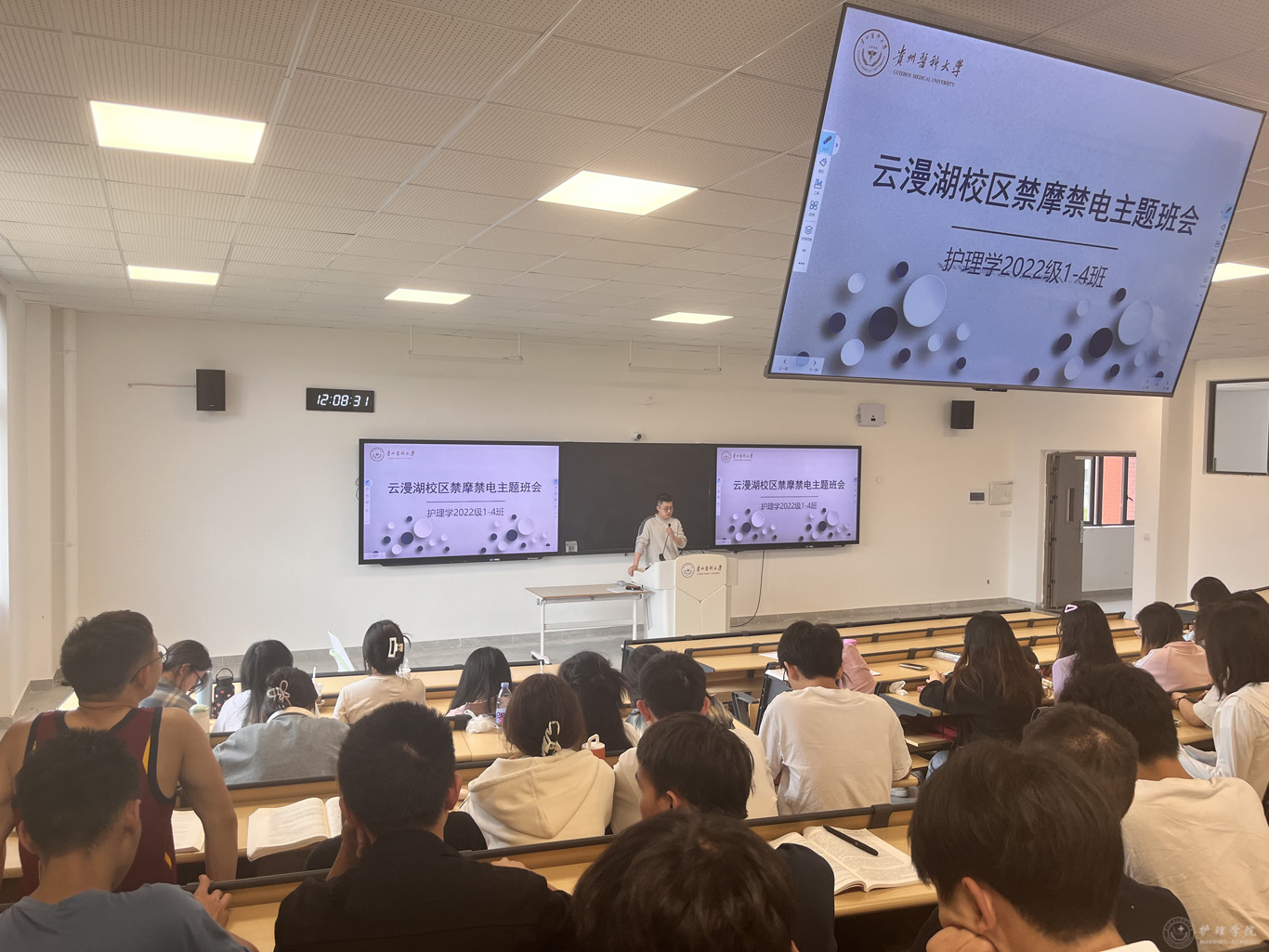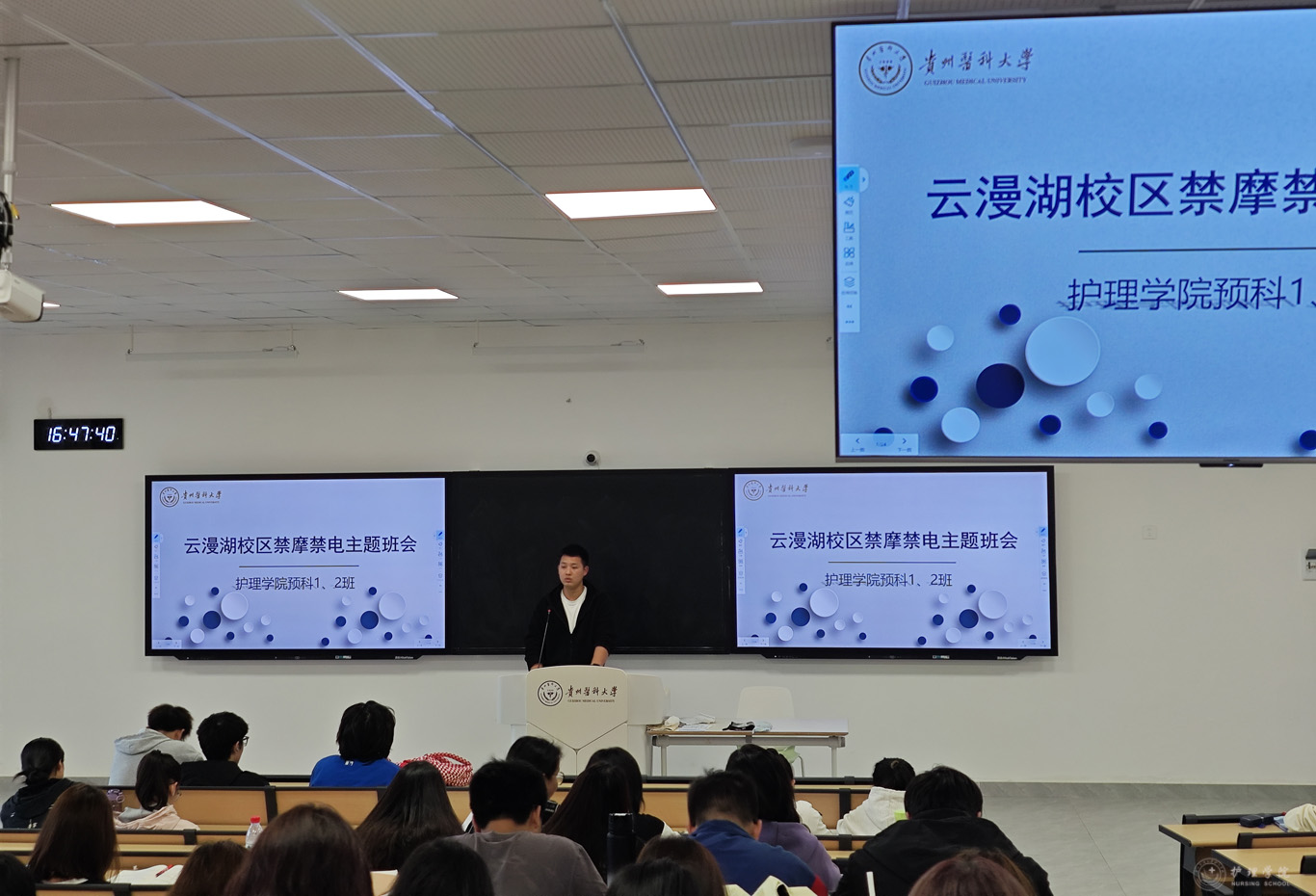班会上,辅导员们结合交通事故案例,从禁摩禁电工作开展的原因、执行的必要性以及具体方案措施和时间节点安排等内容针对禁摩禁电工作向同学们进行了详细的宣传与讲解,使同学们认识到了禁摩禁电工作的重要性。同时,针对夏季安全要点,辅导员们还开展了防溺水教育,提醒同学们不到无安全设施、无救援人员的水域游泳,不在校内水库及水库周边湿地逗留和下水游泳。