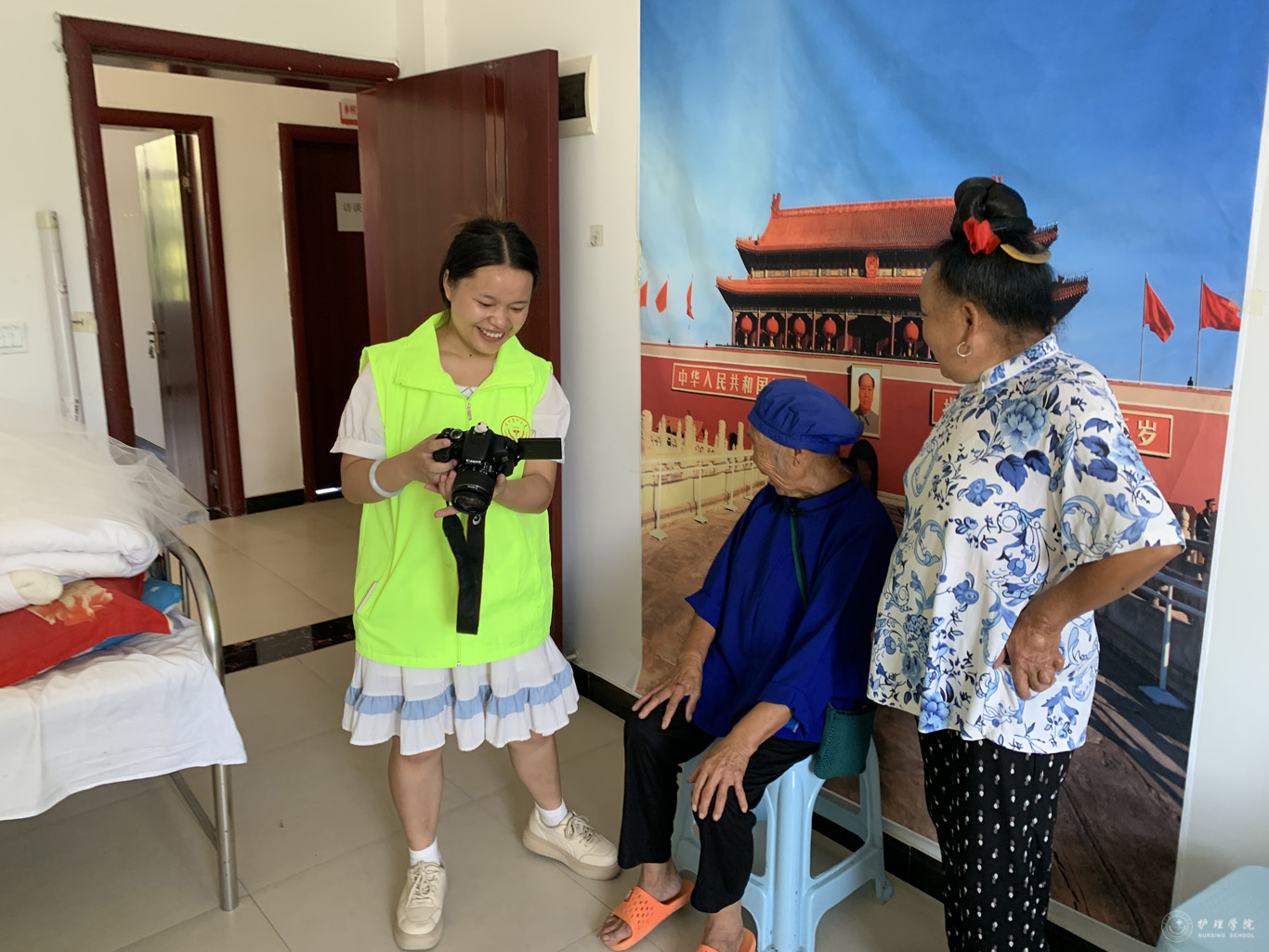 22日清晨,团队一行8人在柏松村村医的带领下,抵达志愿服务的地点。首先,他们来到了柏松村卫生室,在卫生室医疗专业人员的指导下,为村里的老人进行一次免费体检服务,队员们完成了血压测量、血糖检测等常规检查,并向老人们详细解释了检查结果,根据体检情况提供了健康建议。此外,队员们还特地准备了相机,以天安门的画面为背景,为老人们拍摄照片,记录下他们幸福的瞬间,不少老人表示“自己从来没到过天安门,这张以天安门为背景的照片非常珍贵且具纪念意义!”。