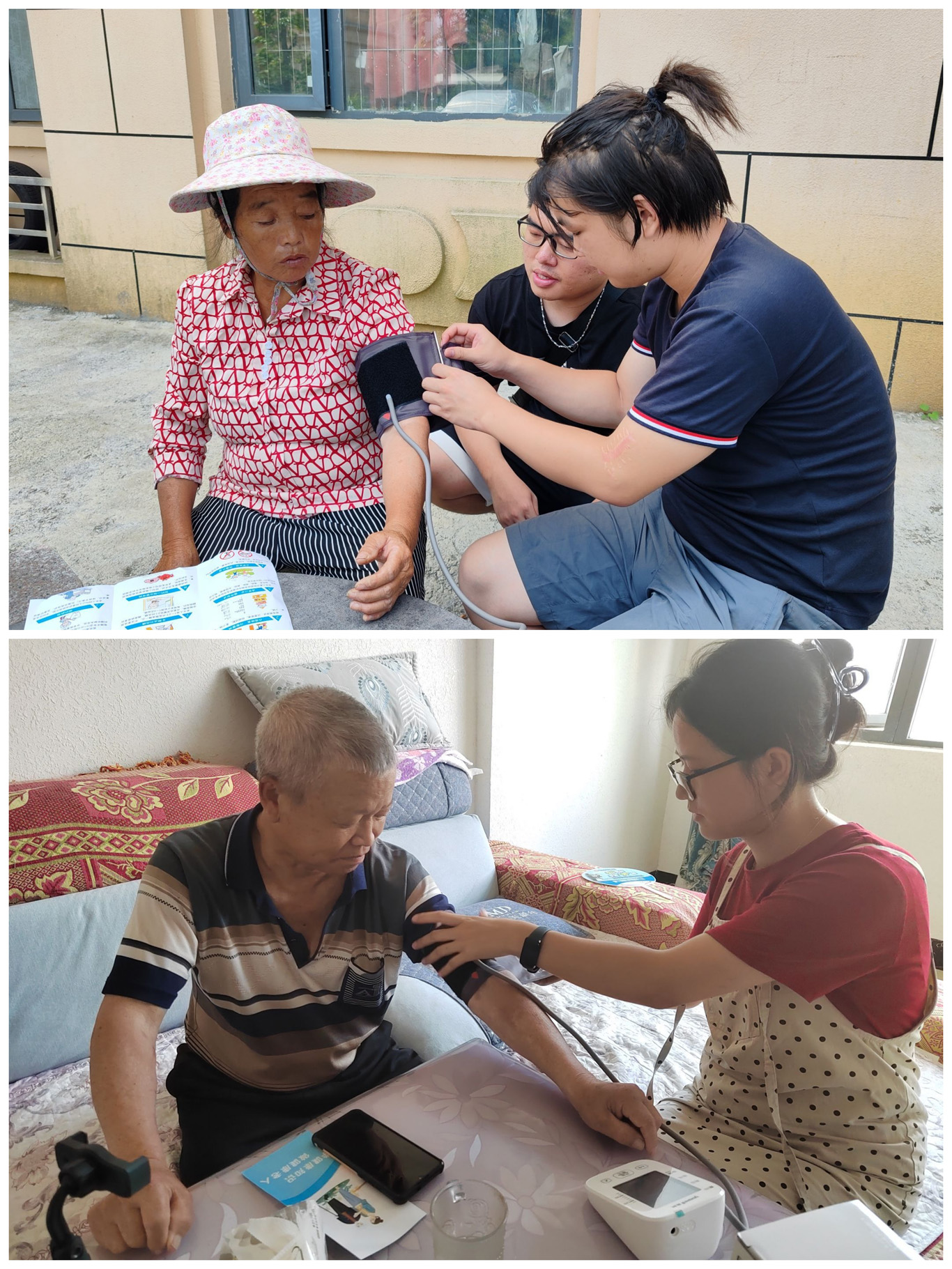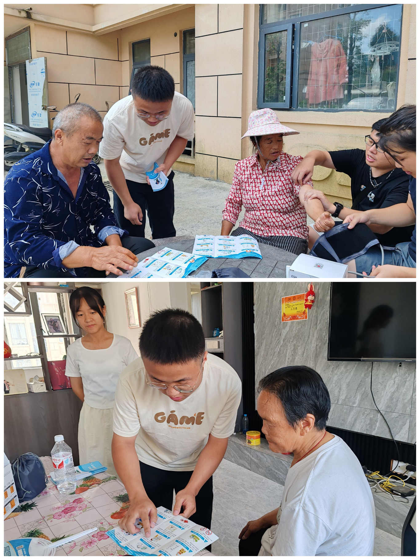 此外,实践队队员们深入社区,走访村户。面向村民进行健康知识宣讲和义诊服务。队员们帮助村民量血压,讲解高血压,糖尿病等各类慢性疾病的相关知识,介绍常用药品的使用方法以及防诈骗的相关知识。并将提前准备好的医疗保健科普手册和反诈骗宣传单分发给村民们。让村民能了解到更多有关于慢性病以及防诈的知识。在走访中聆听老人分享的红色故事红色历史,极大地激发了队员们浓厚的爱国情怀与强烈的传承意识。