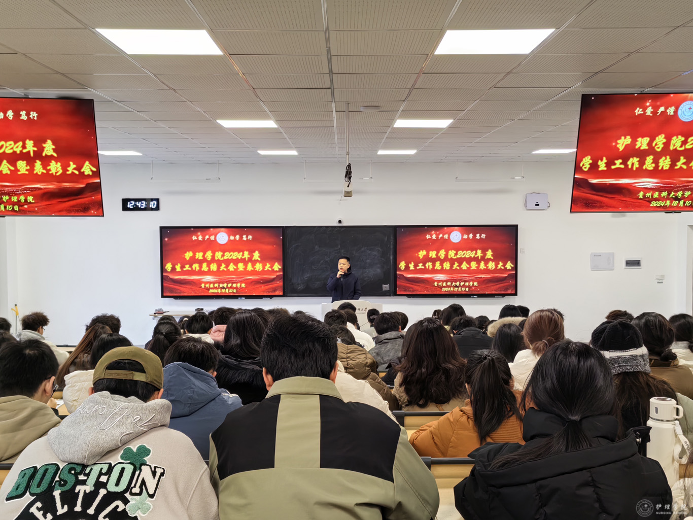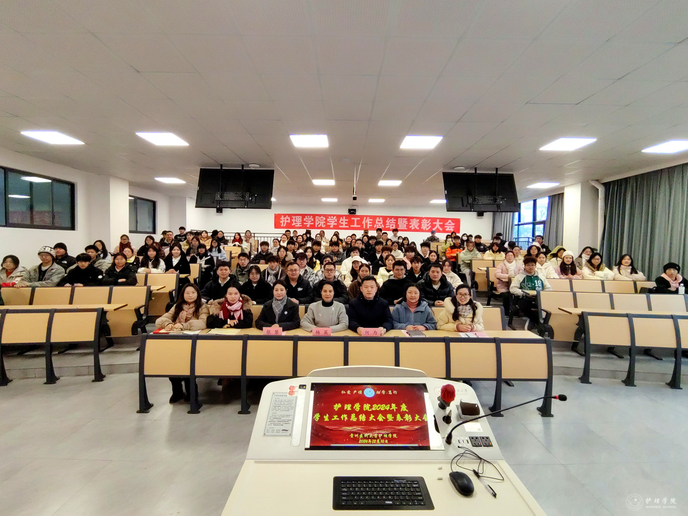 12月10日,为总结学院2024年度学生工作,表彰在学生工作中涌现出的先进集体和优秀个人,allwincity万象城官方网站在云漫湖校区酬勤楼L109召开学生工作总结暨表彰大会。allwincity万象城官方网站党委书记杨英、党委副书记兼纪委书记何为、副处级组织员张黎、正科级组织员曾敏、全体辅导员、受表彰的学生代表参加,会议由学生管理科副科长毕丽主持。