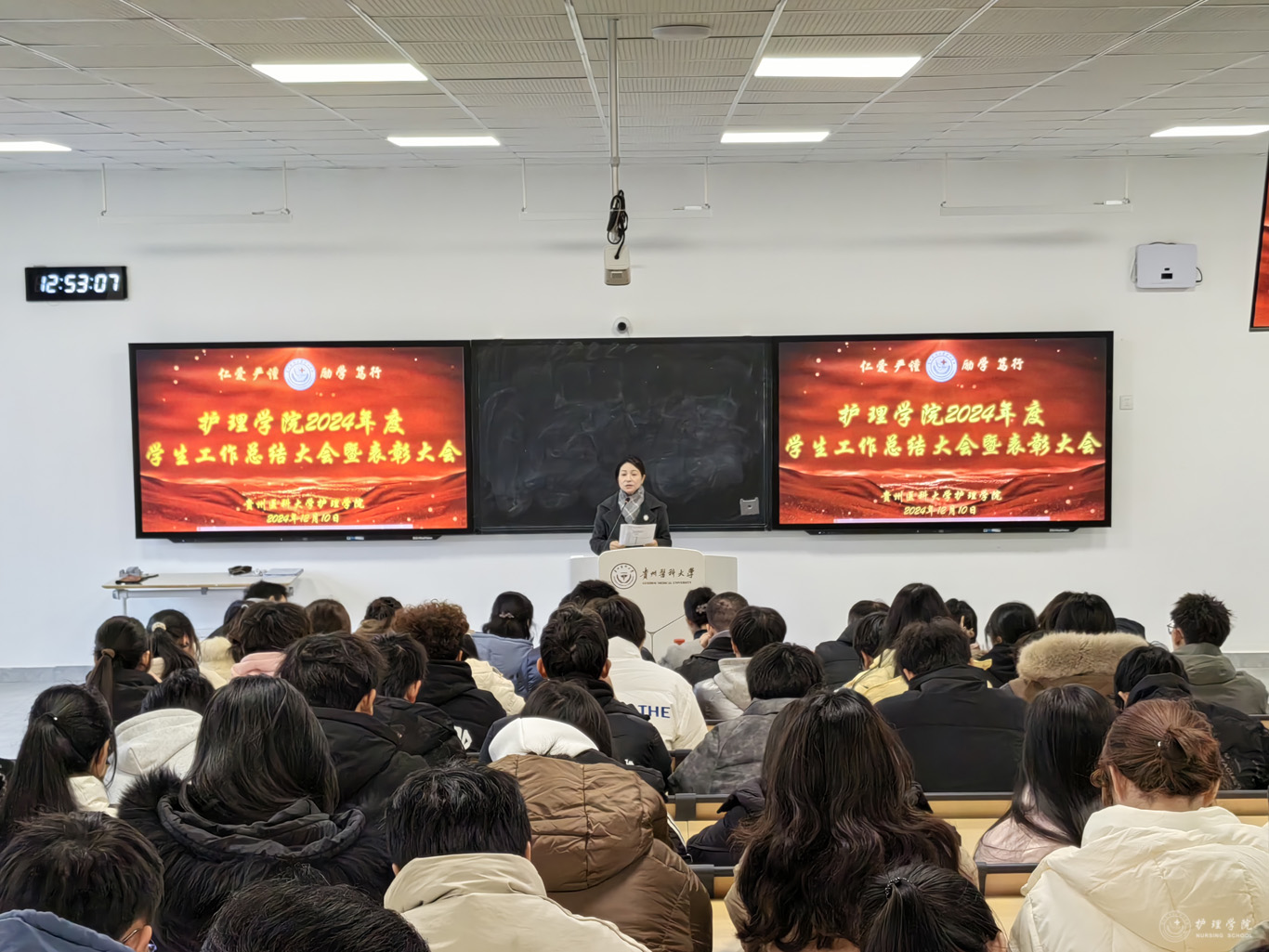 杨英对本次大会进行总结并讲话。她首先对学院学生工作取得的成绩给予肯定,代表学院党委和行政对学院学生工作付出辛勤劳动的老师和同学表示由衷的感谢。随后,她结合护理学专业,从厚植家国情怀到贵医护理人的使命与担当,鼓励同学们主动作为,善做善为,敢于创新,争做熠熠生辉的贵医护理人。同时,她还提出了三点希望:一是要秉持贵医护理人的情怀,注重人文关怀;二是要努力创新,增强本领;三是面对挫折和困难,要保持豁达,不畏艰辛才能一路成长。