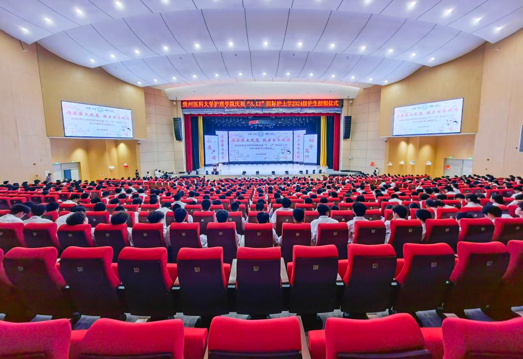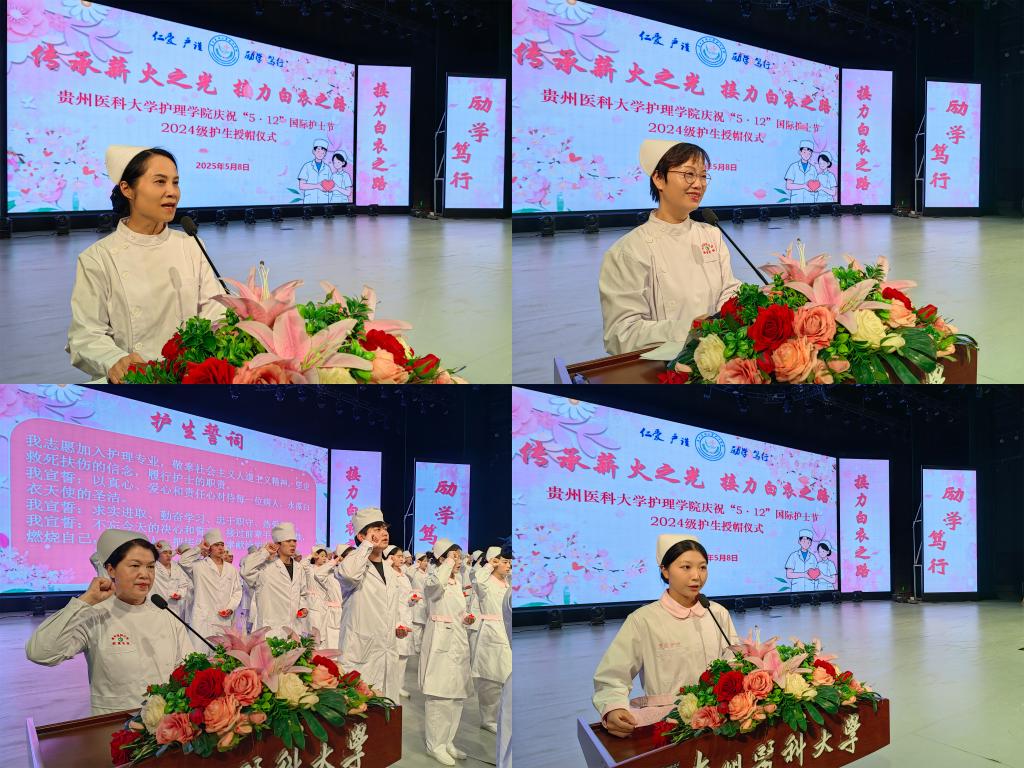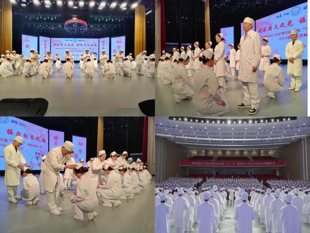 5月8日,为传承南丁格尔精神,激励护理学子逐梦前行,在第114个国际护士节到来之际,allwincity万象城官方网站在云漫湖校区礼堂隆重举办了以“传承薪火之光,接力白衣之路”为主题的2025年“5•12”国际护士节庆祝活动暨2024级护生授帽仪式。活动邀请中山一院贵州医院(贵医附院贵安院区)护理部副主任汤晋、贵州省职工医院护理部副主任周小梅等24位优秀护理前辈为715名护生授帽传烛。学院领导班子、全院教职工及2024级学生参加本次授帽仪式,仪式由院长王秀红主持。