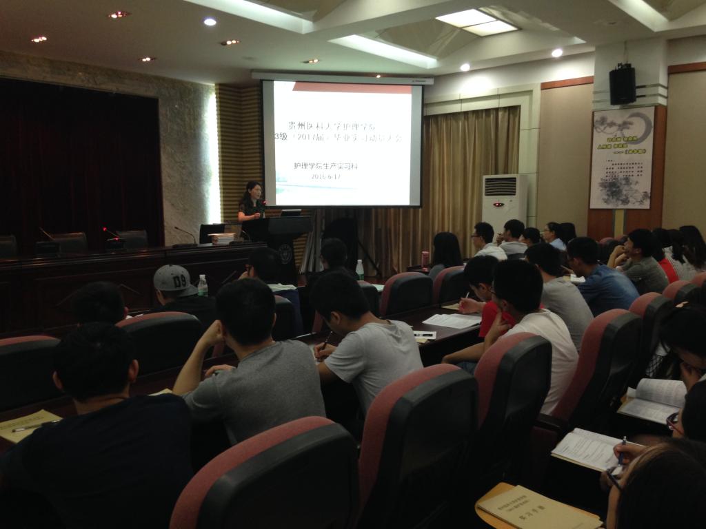 会上,首先邀请贵阳市护理学会理事长周云老师给学生作毕业实习生专业思想动员报告,让学生留下了深刻的印象。接着杨英副书记、刘志燕副院长针对学生在毕业生实习工作态度、工作中如何保护自己等方面做了详细讲解;教会学生如何在工作中进行角色转换、学会独立思考问题并解决问题的方法,工作中一定要吃苦耐劳、主动学习,更重要的是实习期间不能忘掉基础知识,因为基础知识是就业单位招工第一条件、也是考取护士执业资格证的基础;自觉维护集体荣誉感,争取工作表现良好,让自己在实习期间可以脱颖而出,受到用人工作单位的好评。并严格劳动组织纪律,遵守实习医院规章制度,工作态度严谨,不忘“三查七对”实时贯穿于工作中。