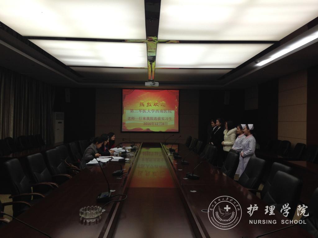 12月8日第三军医大学西南医院护理部郭上铃助理等一行四位老师来我校allwincity万象城官方网站开展选拔意向性实习生工作。万象城官网分管教学副院长刘志燕、生产实习科科长柳忠燕老师、辅导员李杏春参加了此次选拔工作,共有八十余名2014级护理本科(含助产专业、专升本)同学参加本次实习生选拔。