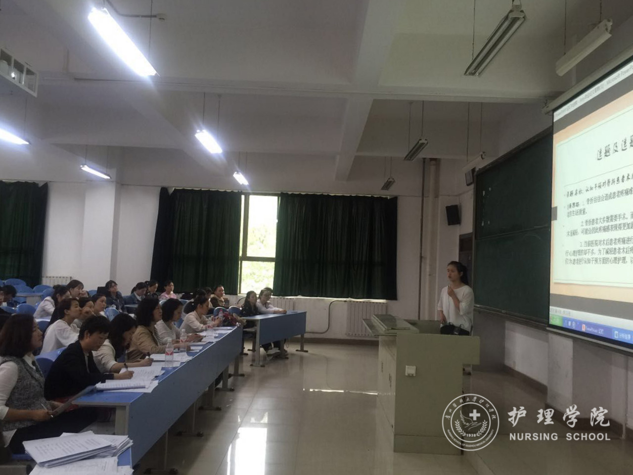 答辩会开始前由主持人介绍了今日答辩会主题,分配学生汇报时间。答辩会开始后,由2013级实习生每组代表用PPT形式向大家展示她们的课题设计,答辩评委从多个角度对同学们的课题设计提出问题,同学们对评委专家的提问一一进行了认真的回答。评委、老师们还对学生课题设计中尚需改进之处给予了中肯的建议。最后,郭院长作了总结点评,对部分有创新性的课题设计如:头皮针改良设计、护理专升本学生实习积极性影响因素的研究等提出了表扬。并鼓励同学们在今后工作中进一步继续完成课题设计的研究。