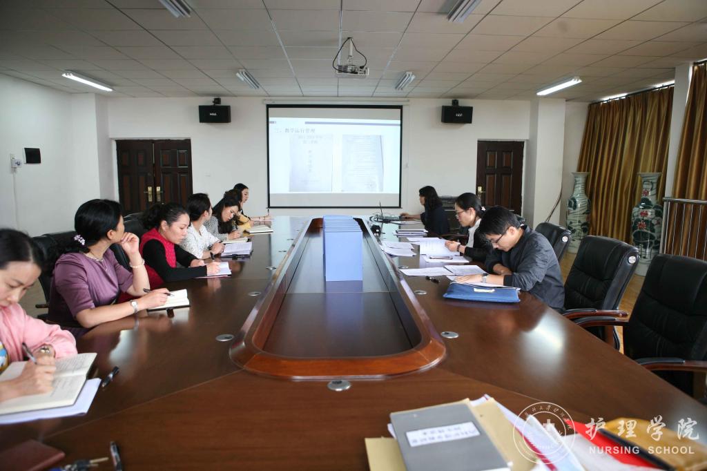 刘志燕就本学期本科教学工作开展情况进行了汇报,从教学管理、教学计划和教学纪律执行、教师教学改革动态、青年教师培养、开展教研活动、学术讲座、教学档案管理及建设情况、教学质量监控、特色与亮点、不足及整改措施等方面,并结合护理学专业认证专家反馈制定的整改方案落实情况进行了PPT汇报。